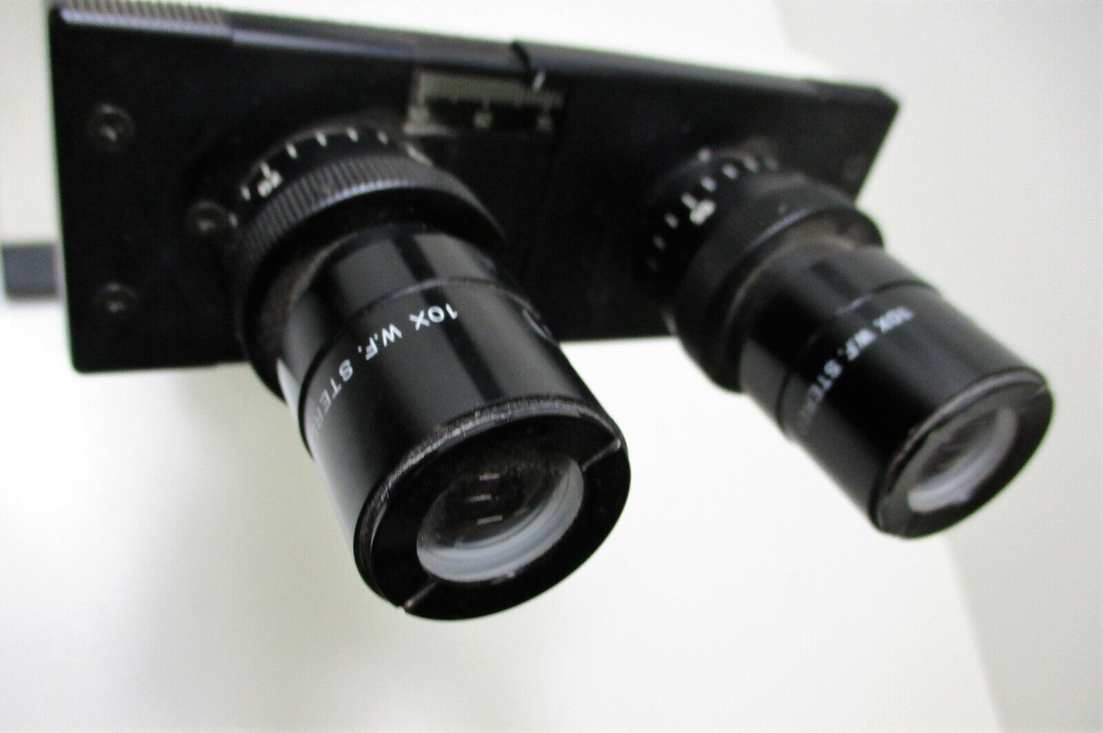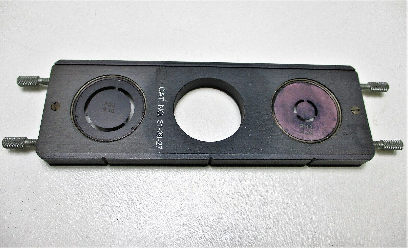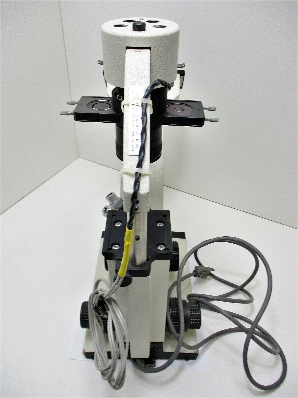 This is a used microscope. This unit has (2) 10X W.F. eyepieces. It also has one objective marked, "Plan 10/0.25 160/12" and one marked, "Plan 20/0.40 160/1.2". It has a third objective that is not marked. It has one "PH2 0.30" filter and one "PH3 0.30" filter. It does not come with a stage. The back focus knobs turn fine and raise the arm up and down. The front knobs do not turn very smoothly, are tight, and feel like they need lubrication. The gasket that is under the turret is damaged as can be seen in the third picture, but the turret seems to spin fine. The lower lamp does not power on when the main power cord is plugged in. We do not have the exact power supply for the upper lamp and are not able to test that component. We are not able to see through the optics because there is no illumination, but no major scratches or damage is seen on any lens or objective. It only comes with what is shown in the pictures and so please check them carefully.