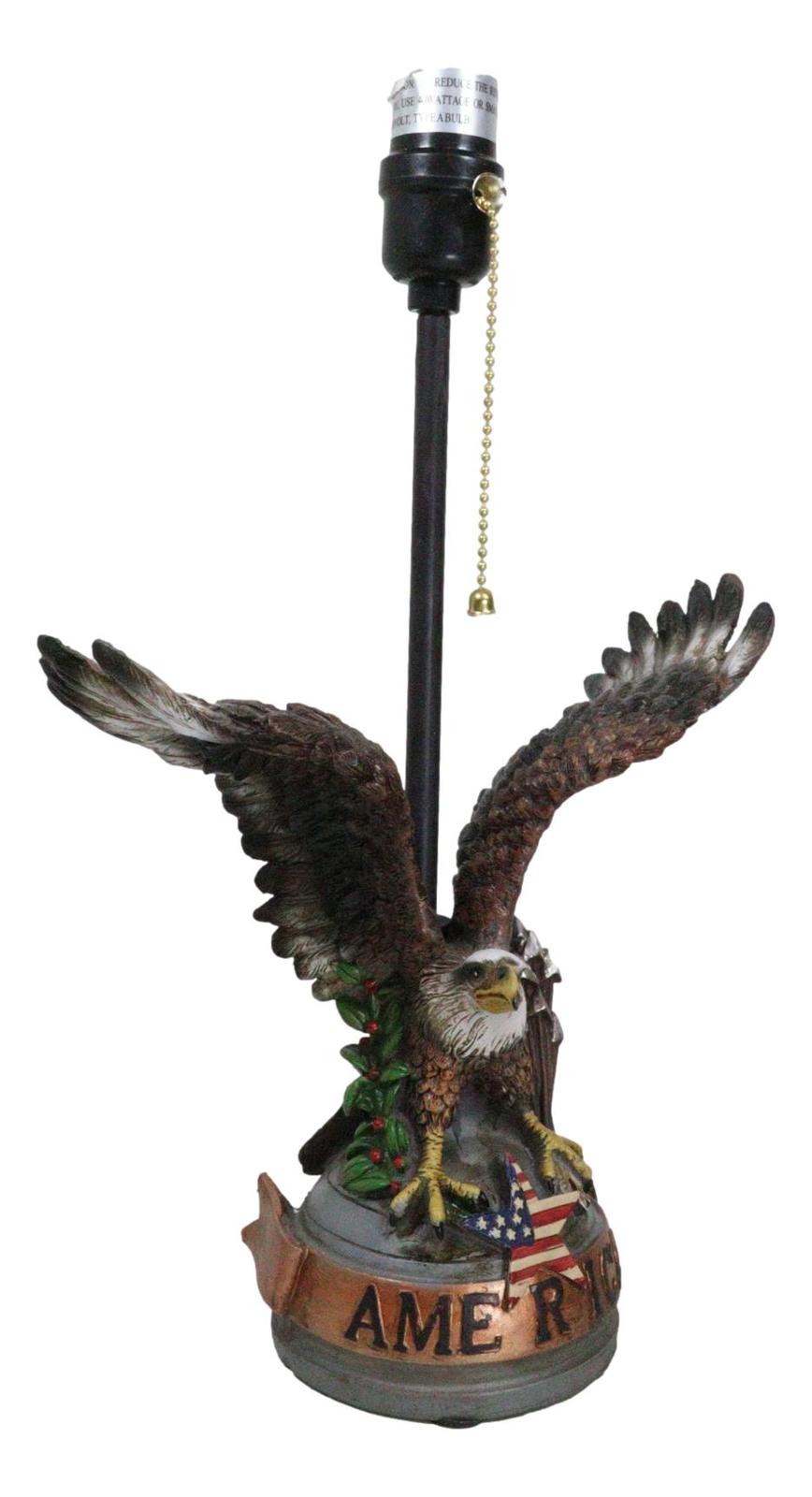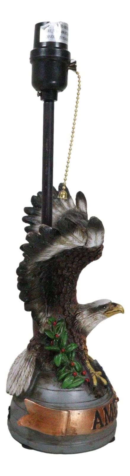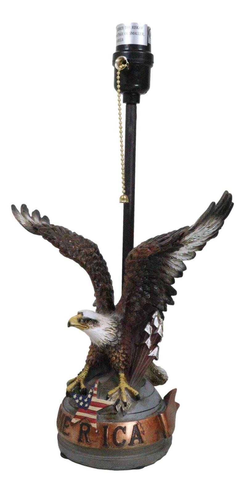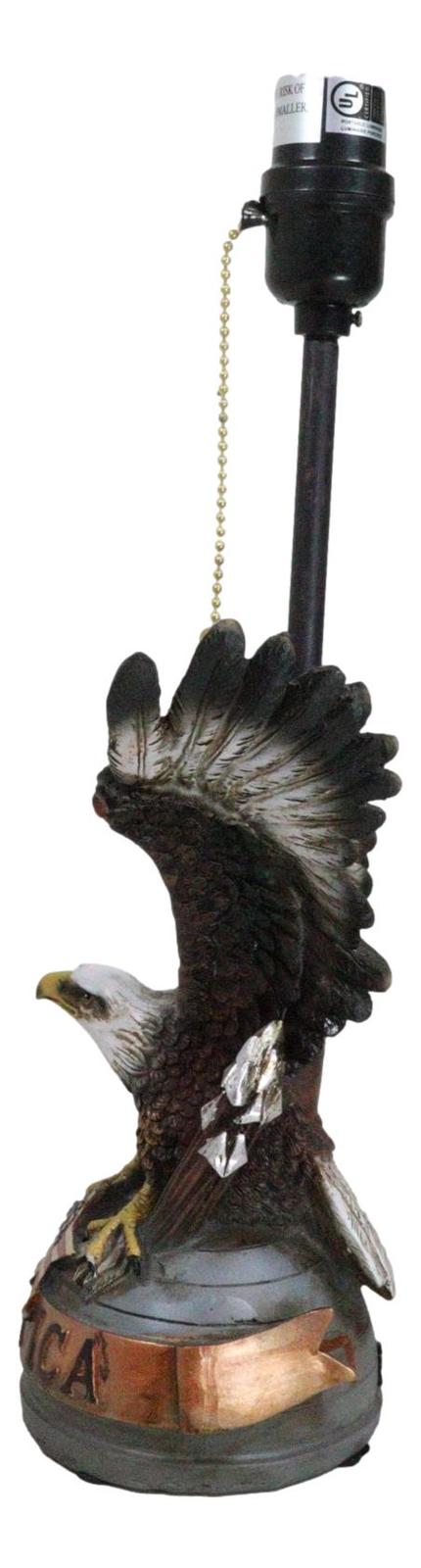 ? Upheld for generations as the image of freedom, the American Bald Eagle comes to life in this impressive, finely detailed Table Lamp Sculpture. Featuring a bald eagle with outspread wings, perching on a western USA Flag Star and a banner that reads America. Add style and patriotism to the office, living room, study room or what have you.