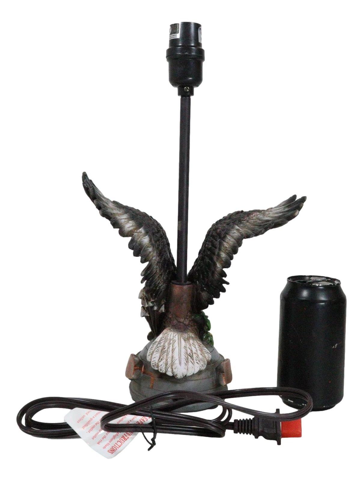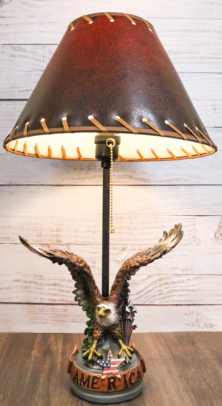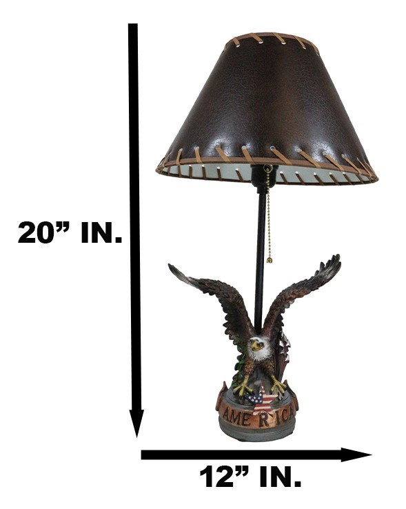 ? Upheld for generations as the image of freedom, the American Bald Eagle comes to life in this impressive, finely detailed Table Lamp Sculpture. Featuring a bald eagle with outspread wings, perching on a western USA Flag Star and a banner that reads America. Add style and patriotism to the office, living room, study room or what have you.