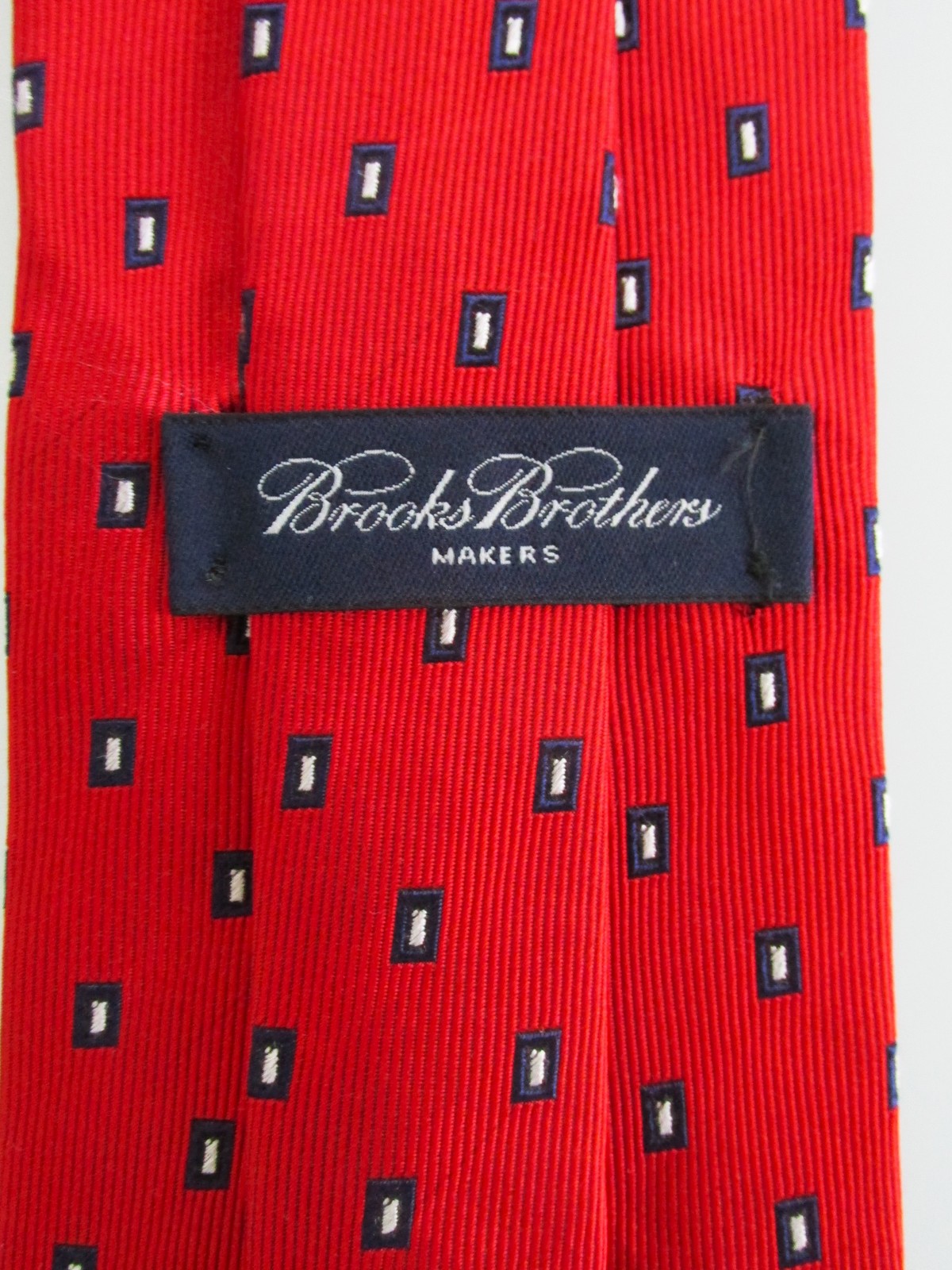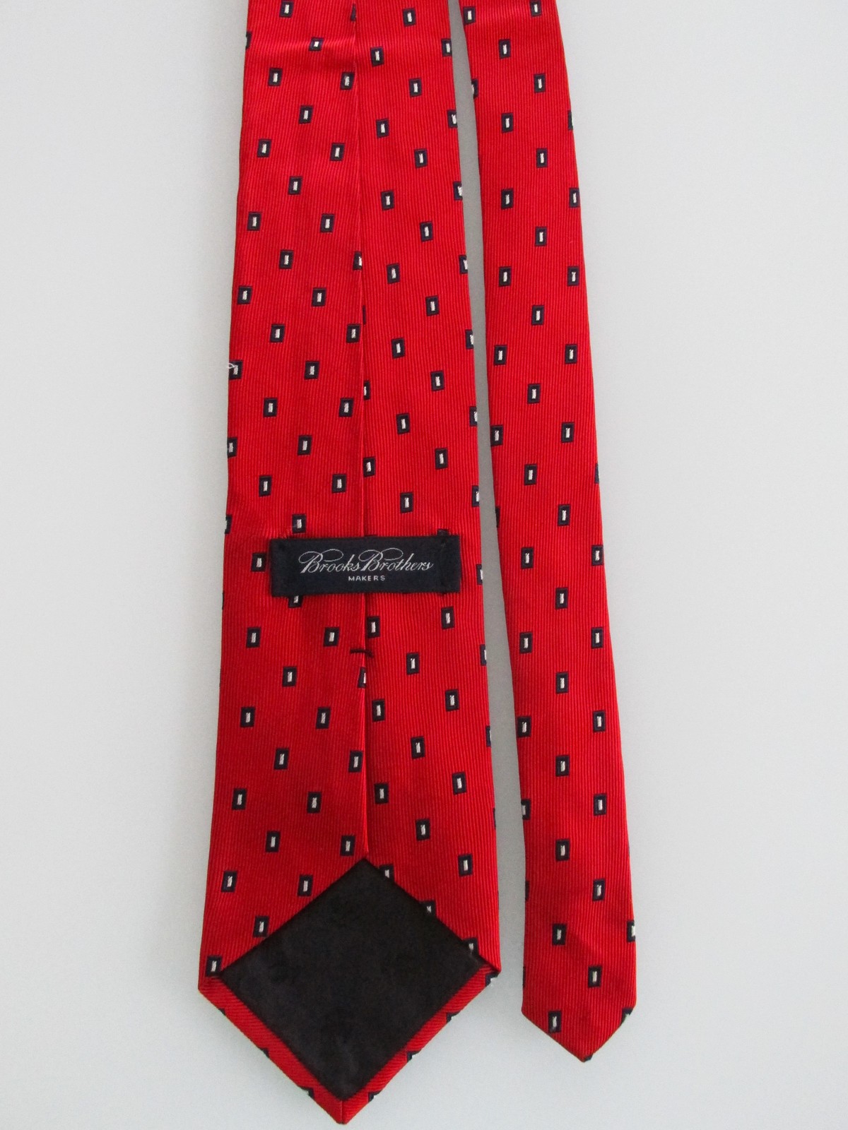 Description: Up for sale is a Brooks Brothers men's narrow silk tie. The tie is handmade in the USA of 100% silk. The tie has a small geometric pattern in navy blue and white on a red micro patterned background. Dimensions are approximately 58" long x 3.75" wide. This tie is in excellent condition.