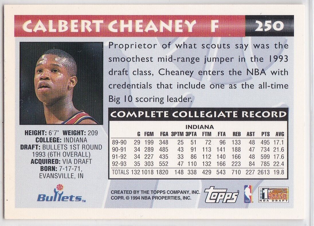 M) 1993-94 Topps Basketball Trading Card - Calbert Cheaney #250