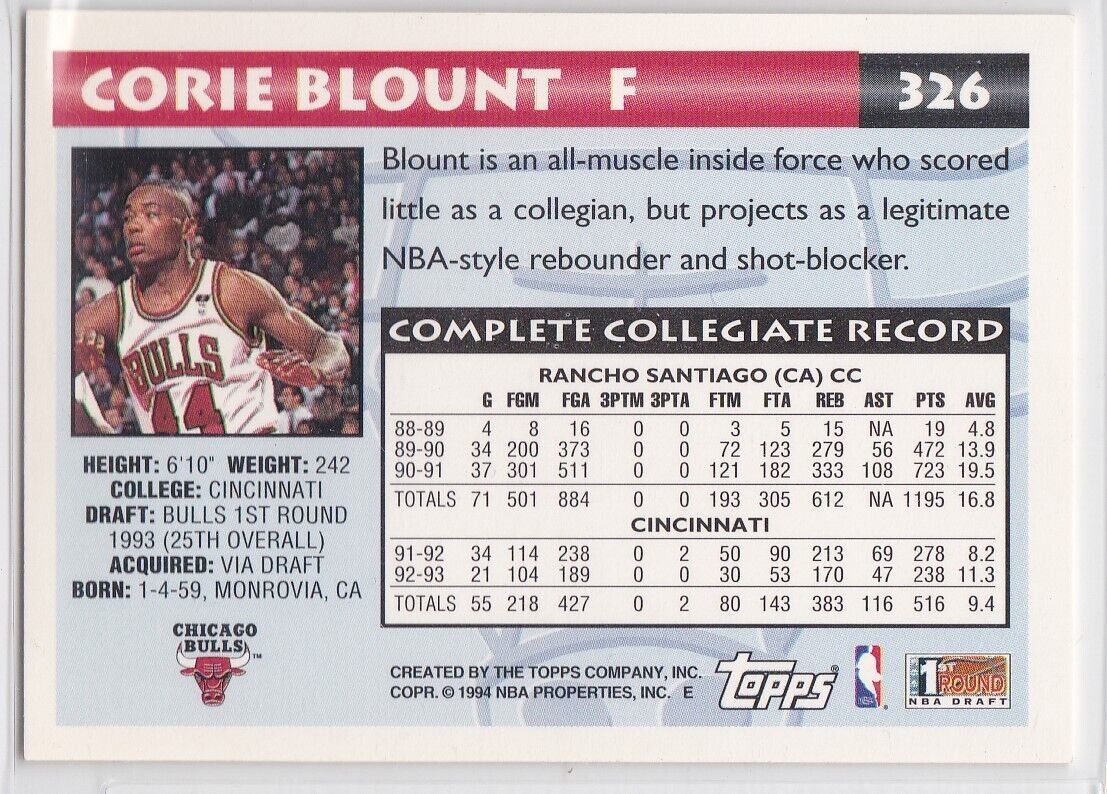 M) 1993-94 Topps Basketball Trading Card - Corie Blount #326