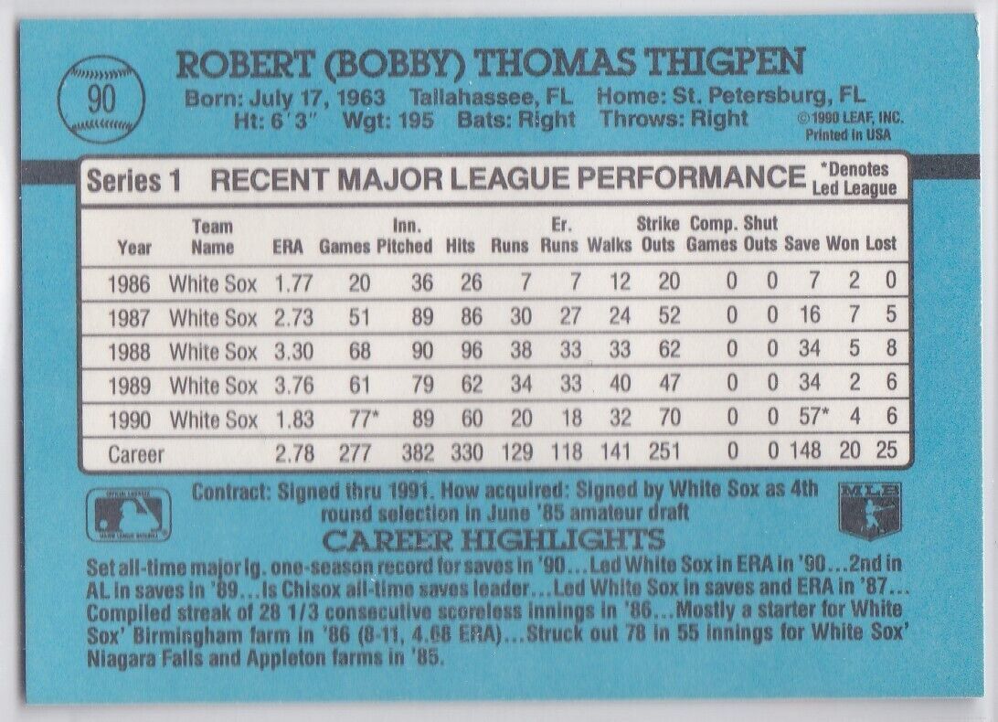 M) 1991 Donruss Baseball Trading Card - Bobby Thigpen #90