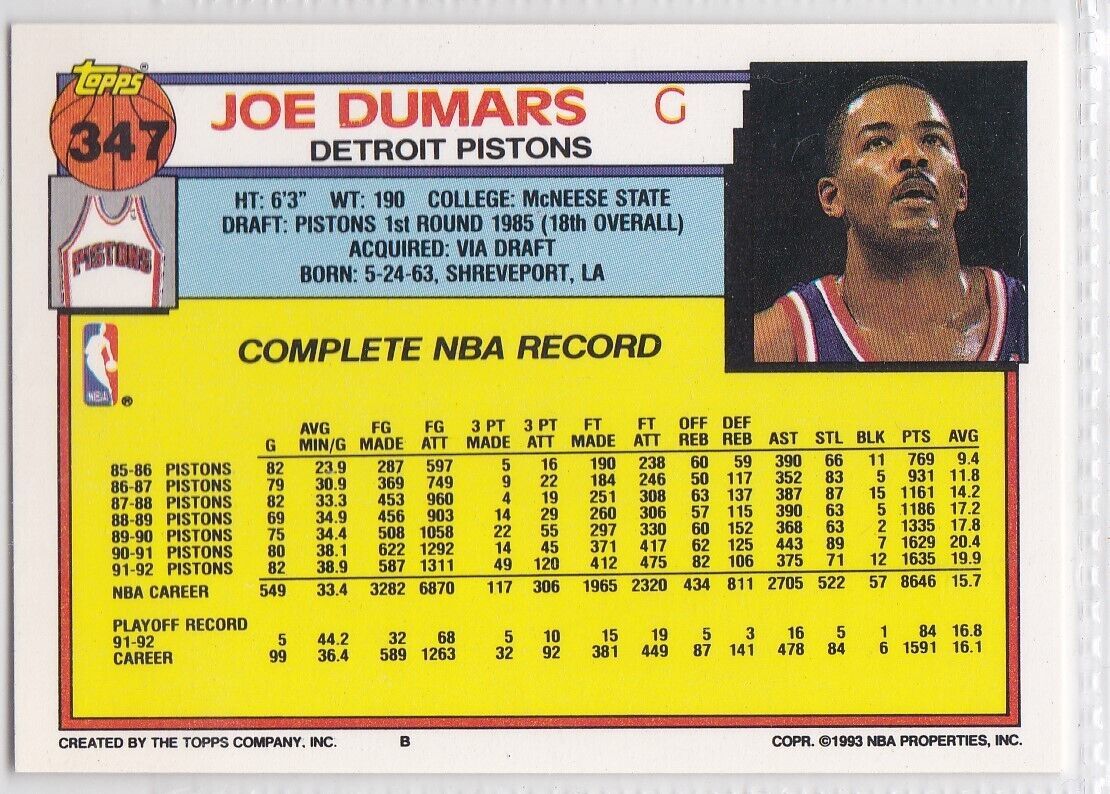 M) 1992-93 Topps Basketball Trading Card - Joe Dumars #347