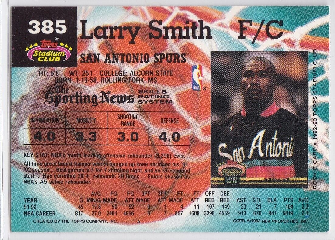 M) 1992-93 Topps Stadium Club Basketball Trading Card - Larry Smith #385