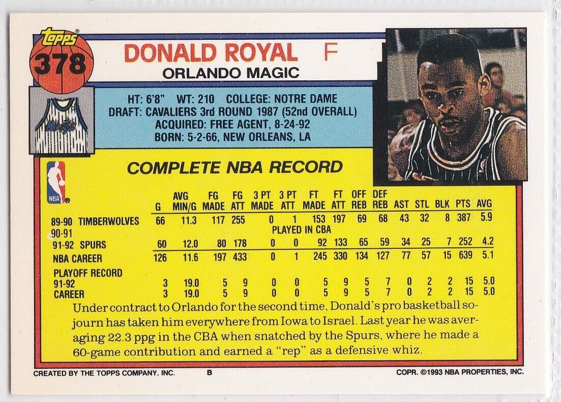 M) 1992-93 Topps Basketball Trading Card - Donald Royal #378
