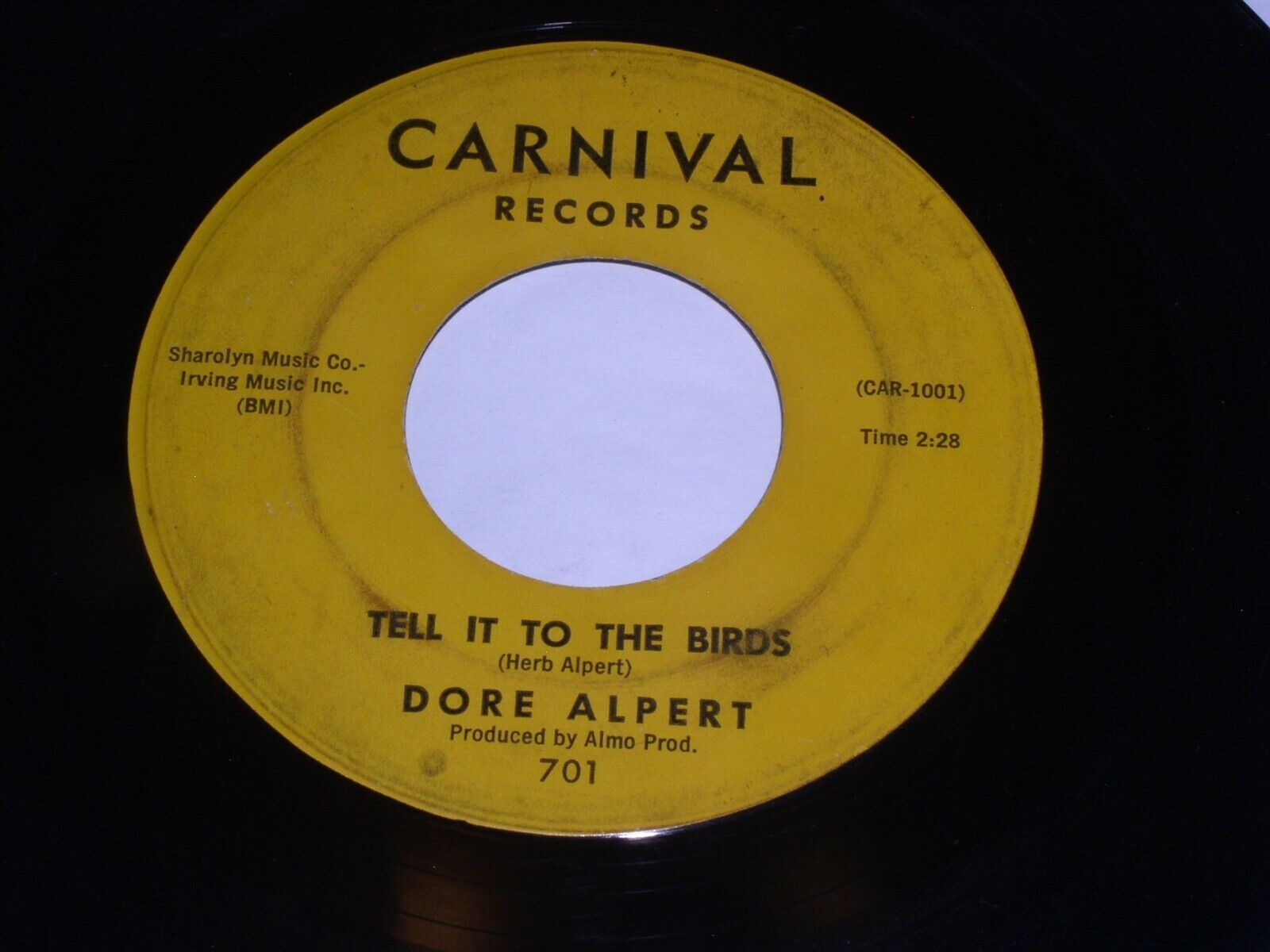 This is a vintage 45 rpm phonograph record by Dore Alpert, entitled, "Tell It To The Birds". Flipside: "Fallout Shelter". Record label: Carnival 701.