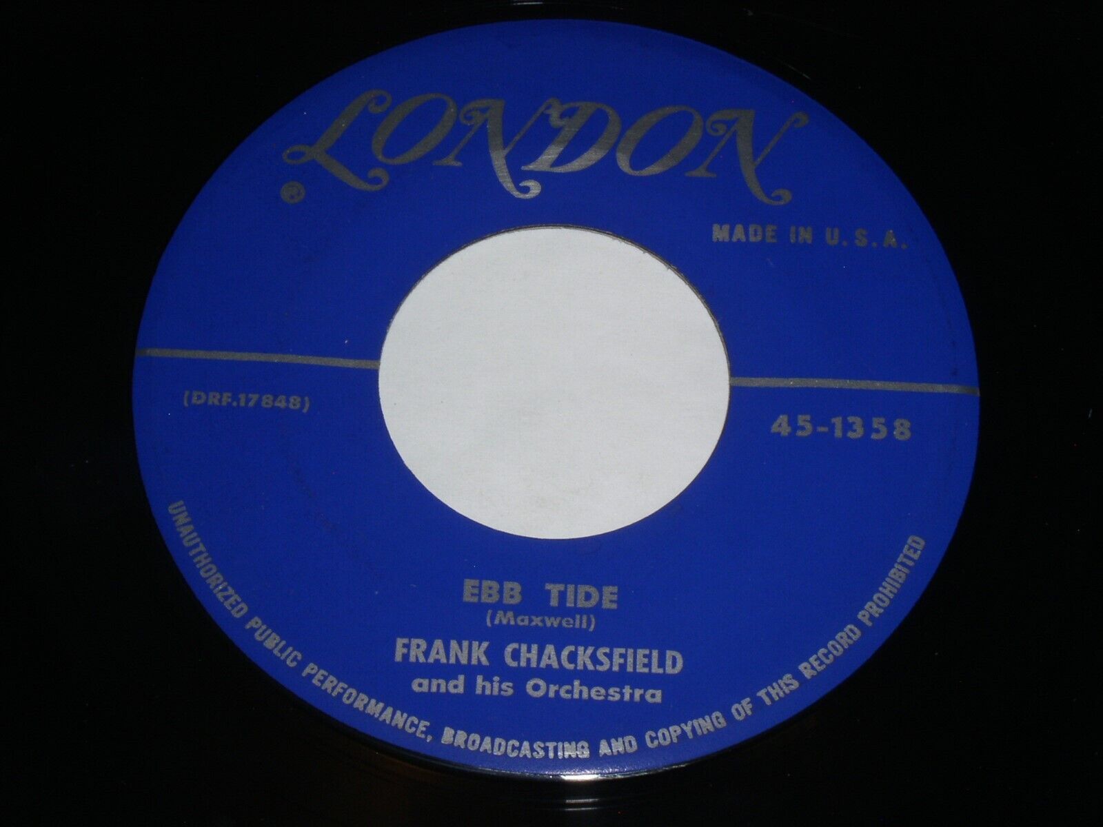 This is a vintage 45 rpm phonograph record by Frank Chacksfield, entitled, "Ebb Tide". Flipside: "Waltzing Bugle Boy". Record label: London 45-1358.