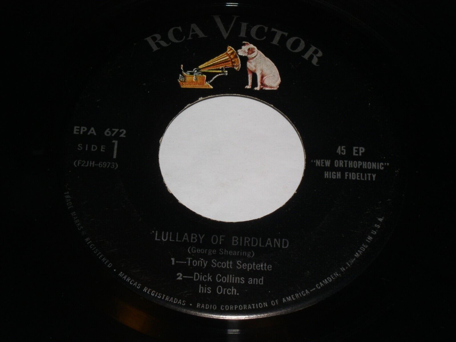 This is a vintage 45 rpm Extended Play phonograph record entitled, "Lullaby Of Birdland". Record label: RCA EPA 672. Song renditions by: Gony Scott Septette, Dick Collins and his Orch., Joe Newman Octette and Quicy Jones and his Orch.