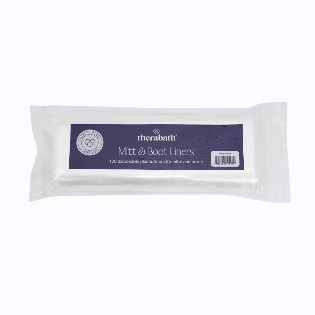 Durable, disposable Therabath Boot/Mitt Liner Bags 9" x 15". Stapled to a header card for easy dispensing. Contains 100 liners.
