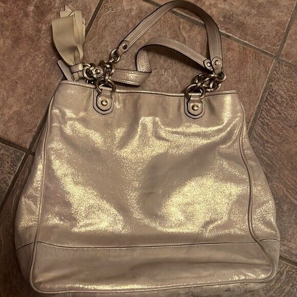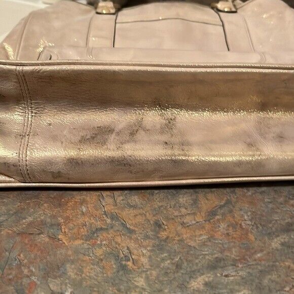 Metallic large tote with 3 compartments middle zipper with gold hardware. Front clip pocket, gold coated leather with gold-tone hardware. It features dual handles that are a combination of gold-tone chain link and leather, a front exterior pocket with 2 push-lock closures, both a leather and a grosgrain ribbon hang-tag and a top magnetic snap closure. The roomy interior is lined with sateen fabric and includes a center zip-close divider pocket, a zip wall pocket on one side and 2 slip wall pockets on the opposite side. Some stains on bottom of bag, please see photo.