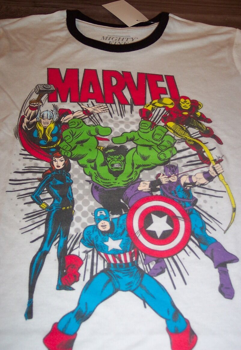 This is a VINTAGE STYLE WOMEN'S TEEN Marvel Comics THE AVENGERS CAPTAIN AMERICA, BLACK WIDOW, THE MIGHTY THOR, IRON MAN, THE INCREDIBLE HULK, HAWKEYE, T-shirt. It is a Size XS and is NEW with the tag. It is 16 1/2 inches from armpit to armpit and 21 inches in length. Combine auctions to save on shipping. D2AG