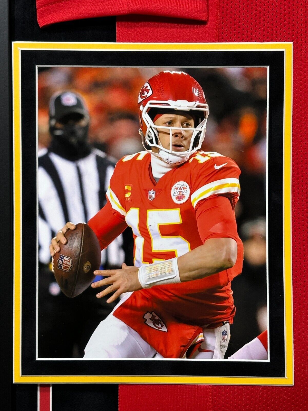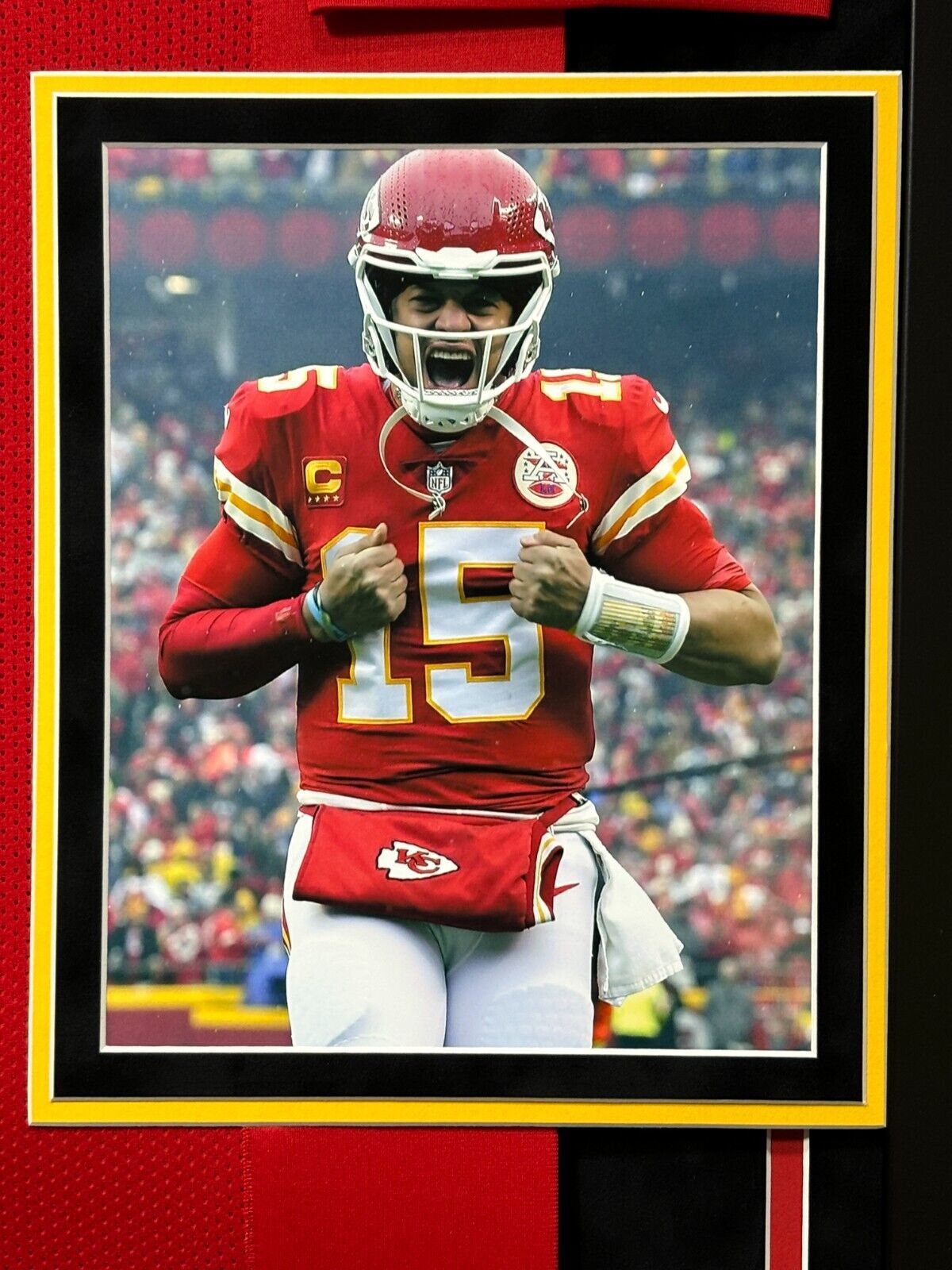Chiefs fans, pay homage to one of the best to ever do it!! This incredible framed collage features a Kansas City Chiefs red home jersey autographed by football superstar, Patrick Mahomes! This is a must-have for all man caves, offices, game rooms and lady lairs!