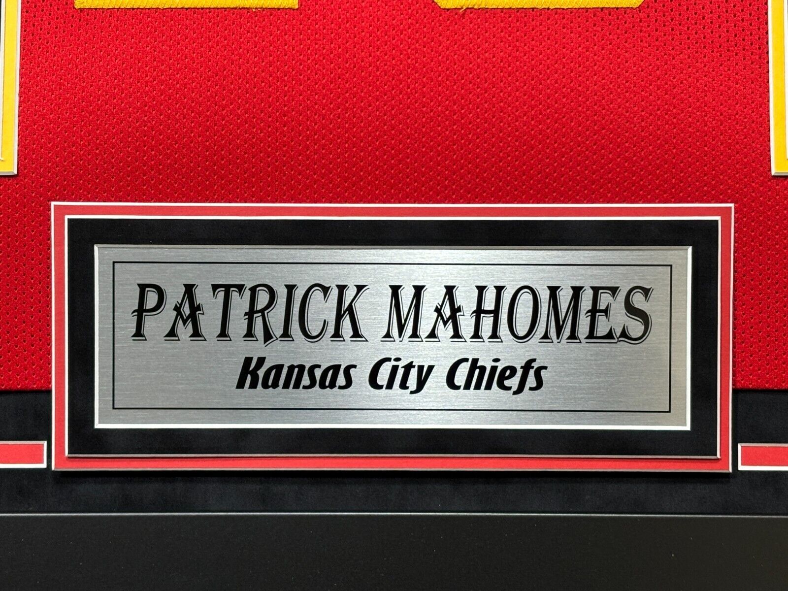 This item is professionally museum quality professionally custom framed in a black frame that features double matting including a suede top mat as well as a plexi glass display, a laser cut team logo, a metal nameplate at the bottom of the frame and (2) 8x10 Photos. This frame, which arrives on your doorstep ready to hang, measures approximately 40" x 43" x 2" and is a brand-new frame job whereas it has never displayed. Don't settle for less, if you are looking for a top quality frame job for your Patrick Mahomes Signed framed jersey, then this is the one for you. Quality unmatched from the materials to the design layout and throughout!