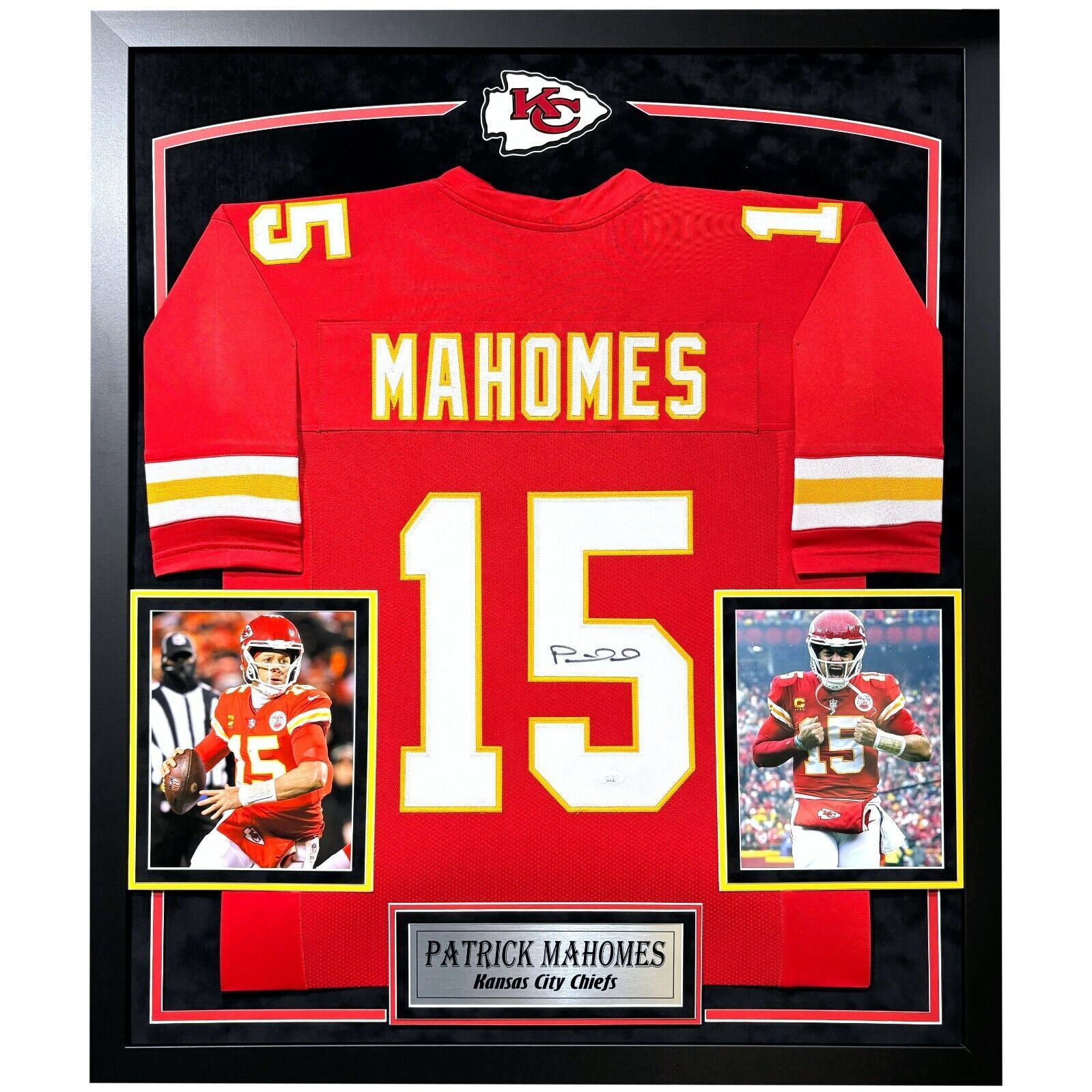 Chiefs fans, pay homage to one of the best to ever do it!! This incredible framed collage features a Kansas City Chiefs red home jersey autographed by football superstar, Patrick Mahomes! This is a must-have for all man caves, offices, game rooms and lady lairs! This item is professionally museum quality professionally custom framed in a black frame that features double matting including a suede top mat as well as a plexi glass display, a laser cut team logo, a metal nameplate at the bottom of the frame and (2) 8x10 Photos. This frame, which arrives on your doorstep ready to hang, measures approximately 40" x 43" x 2" and is a brand-new frame job whereas it has never displayed. Don't settle for less, if you are looking for a top quality frame job for your Patrick Mahomes Signed framed jersey, then this is the one for you. Quality unmatched from the materials to the design layout and throughout! Certificate of Authenticity: This item has been certified AUTHENTIC by one of the most reputable and recognized authenticators in the business today, James Spence Authentication (JSA). This item comes with a JSA numbered tamper-proof authentication sticker and Certificate of Authenticity card that can be reviewed on their website 24/7/365 to guarantee its authenticity. Note: This is a stock item where we are using stock images for this listing. The autograph quality may vary, as well as the location of the autograph. Jersey style numbering may vary from photos pictured. The jersey itself is a custom unbranded jersey with no logos or marks throughout.