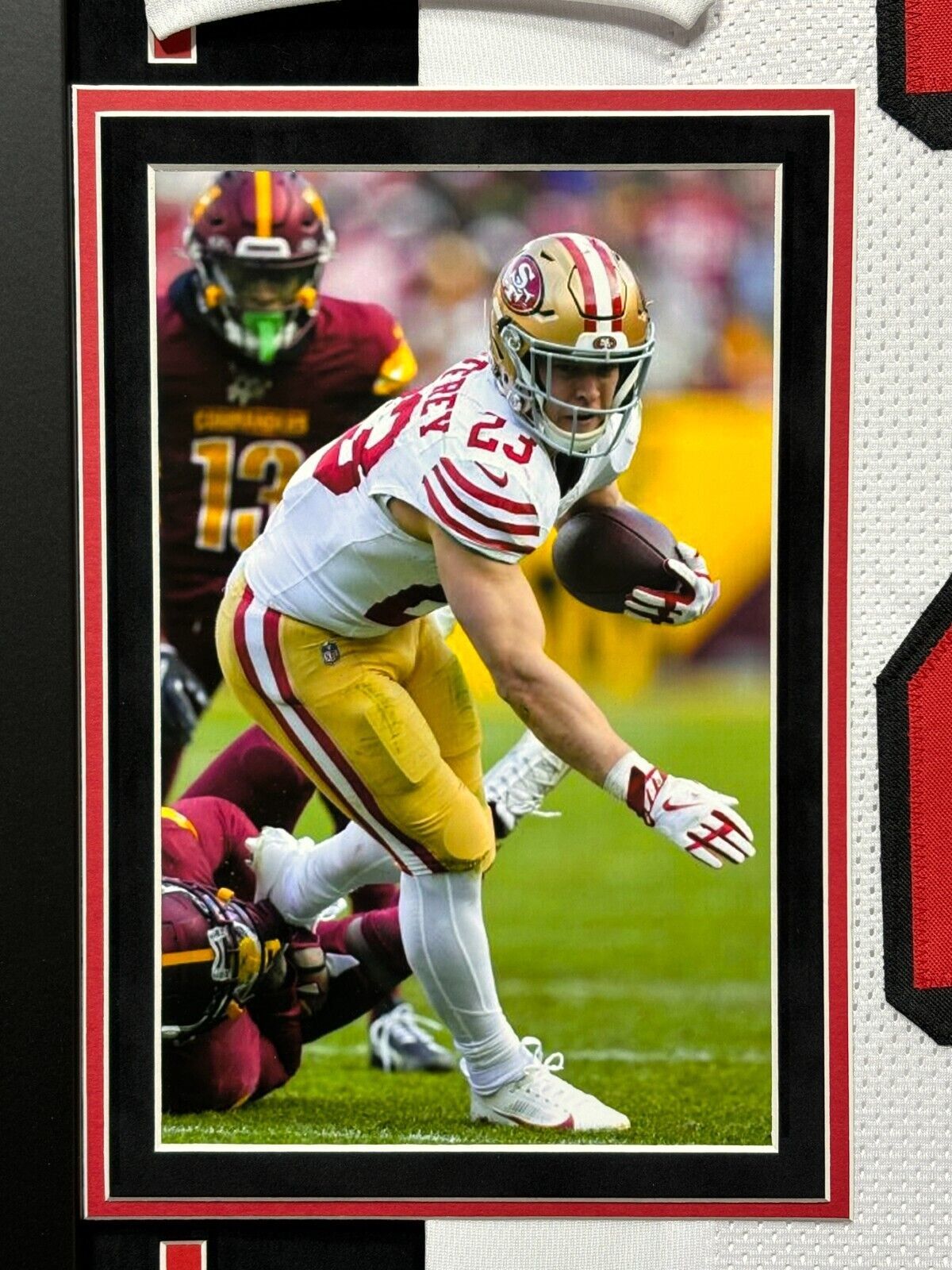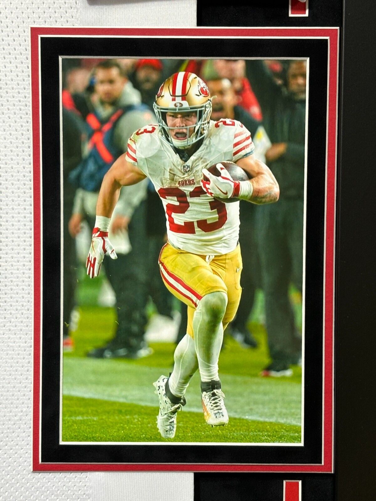 Niners fans, pay homage to one of the best in the NFL today!! This incredible framed collage features a San Francisco 49ers white jersey autographed by football superstar, Christian McCaffrey! This is a must-have for all man caves, offices, game rooms and lady lairs!