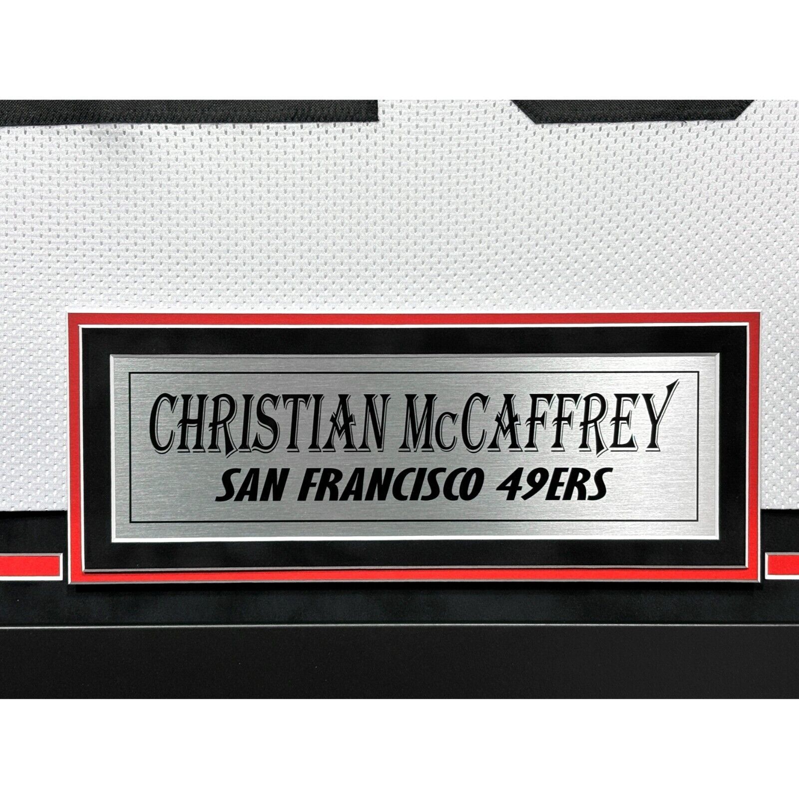 Niners fans, pay homage to one of the best in the NFL today!! This incredible framed collage features a San Francisco 49ers white jersey autographed by football superstar, Christian McCaffrey! This is a must-have for all man caves, offices, game rooms and lady lairs! This item is professionally museum quality professionally custom framed in a black frame that features double matting including a suede top mat as well as a plexi glass display, a laser cut team logo, a metal nameplate at the bottom of the frame and (2) 8x10 Photos. This frame, which arrives on your doorstep ready to hang, measures approximately 40" x 43" x 2" and is a brand-new frame job whereas it has never displayed. Don't settle for less, if you are looking for a top quality frame job for your Christian McCaffrey Signed framed jersey, then this is the one for you. Quality unmatched from the materials to the design layout and throughout! Certificate of Authenticity: This item has been certified AUTHENTIC by one of the most reputable and recognized authenticators in the business today, Beckett Authentication Services (BAS). This item comes with a BAS numbered tamper-proof authentication sticker and QR code card that can be reviewed on their website 24/7/365 to guarantee its authenticity. Note: This is a stock item where we are using stock images for this listing. The autograph quality may vary, as well as the location of the autograph. Jersey style numbering may vary from photos pictured. The jersey itself is a custom unbranded jersey with no logos or marks throughout.