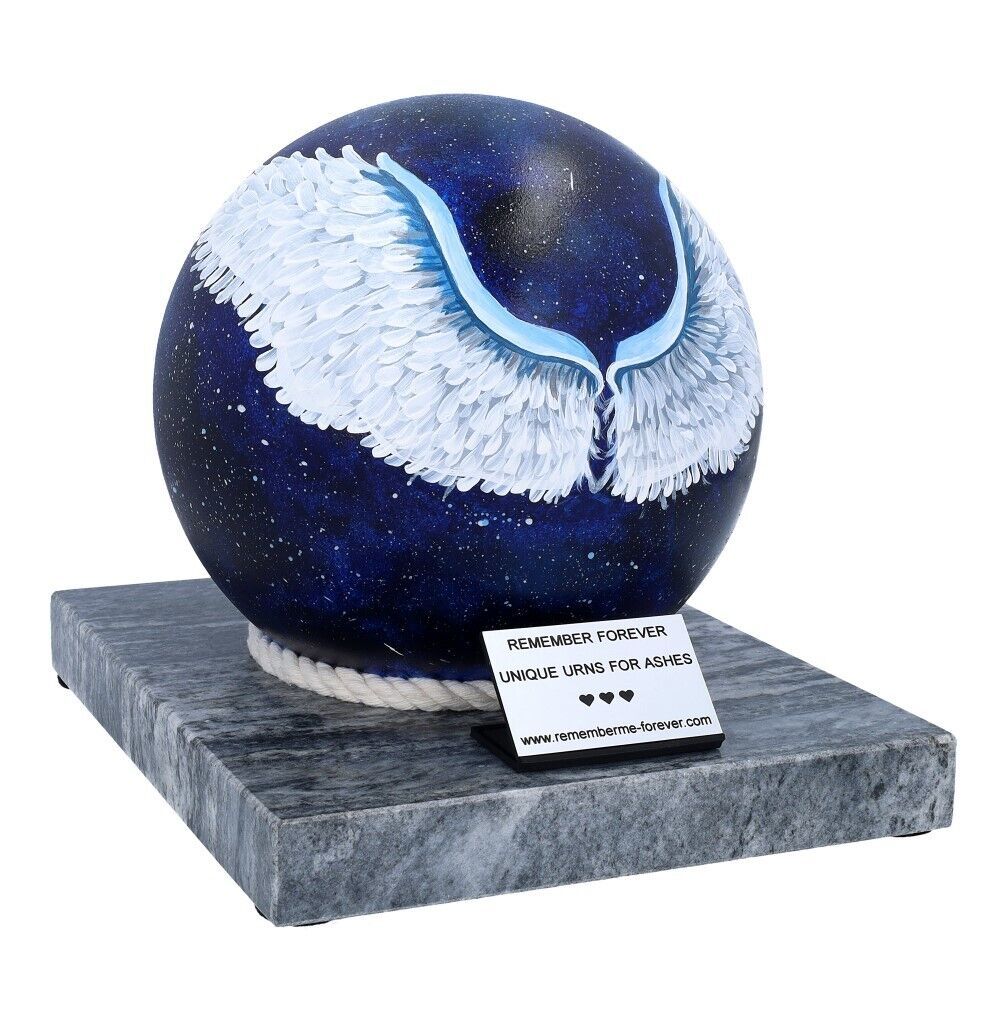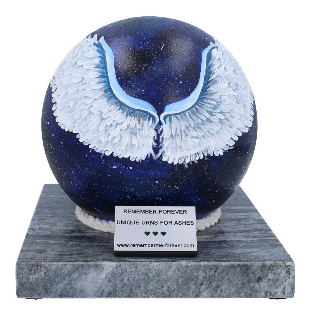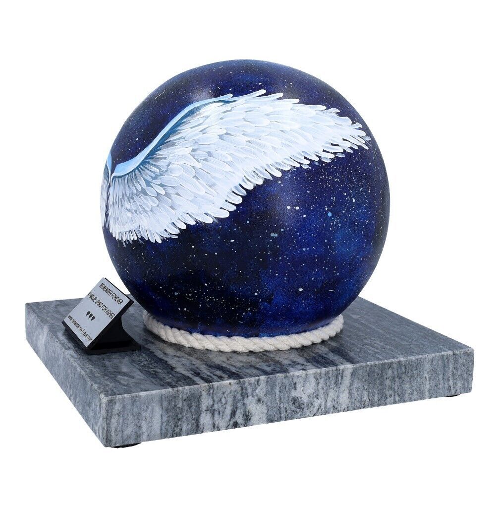Cremation urn srafted with meticulous attention to details. This urn features a hand-painted stainless steel sphere, showcasing the graceful curvature of angel wings as they soar across a celestial backdrop of twinkling stars.