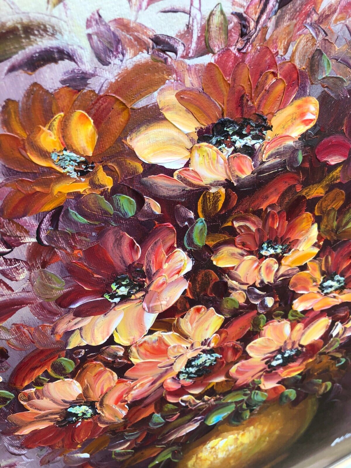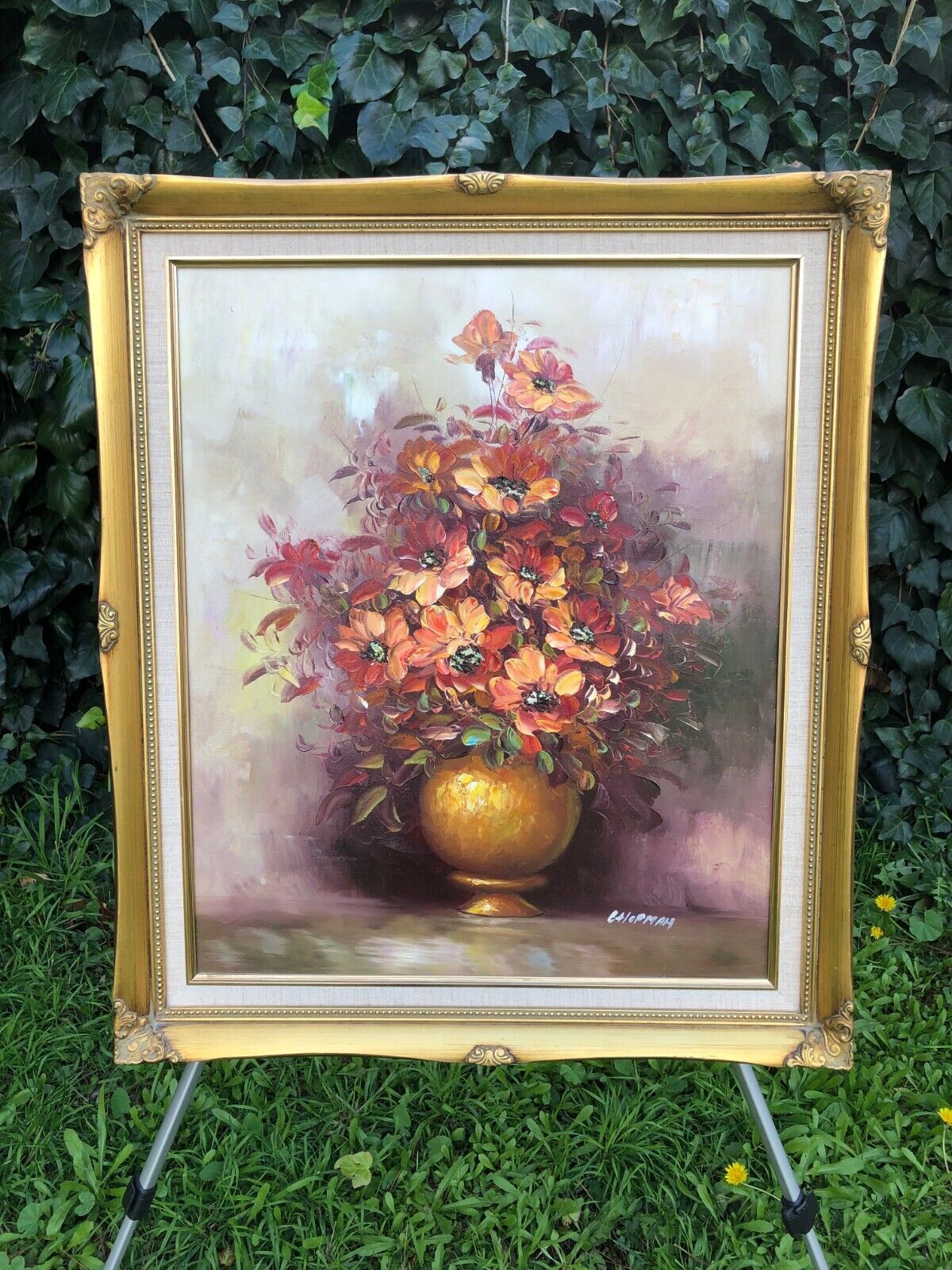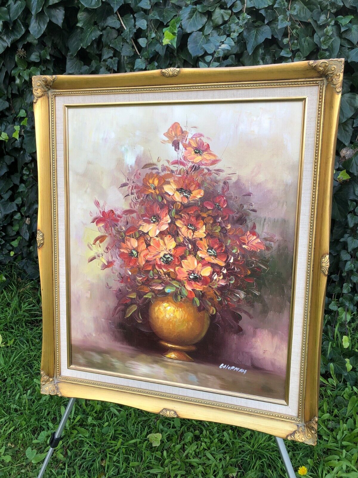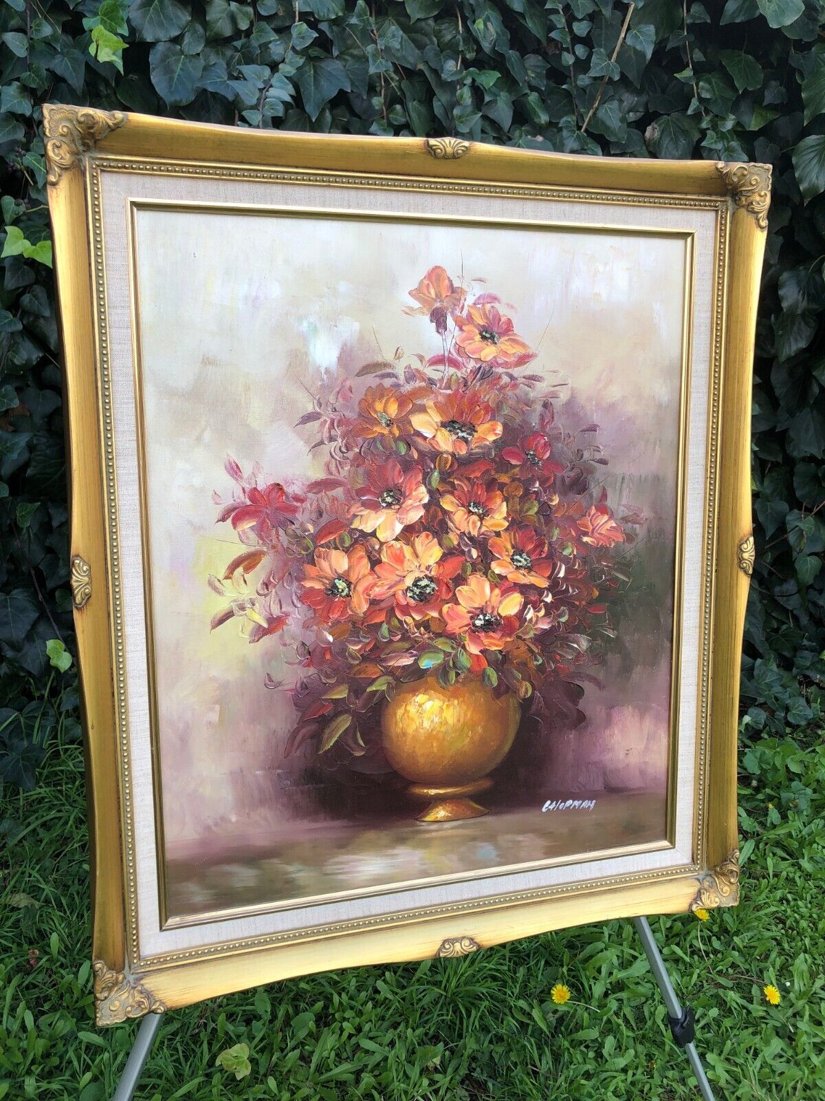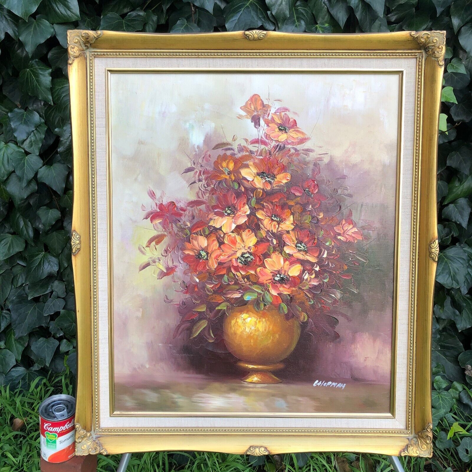 VINTAGE OIL PAINTING MASTERFUL 1970s MID CENTURY FLORAL Canvas Gold Gilt Frame
