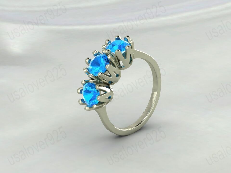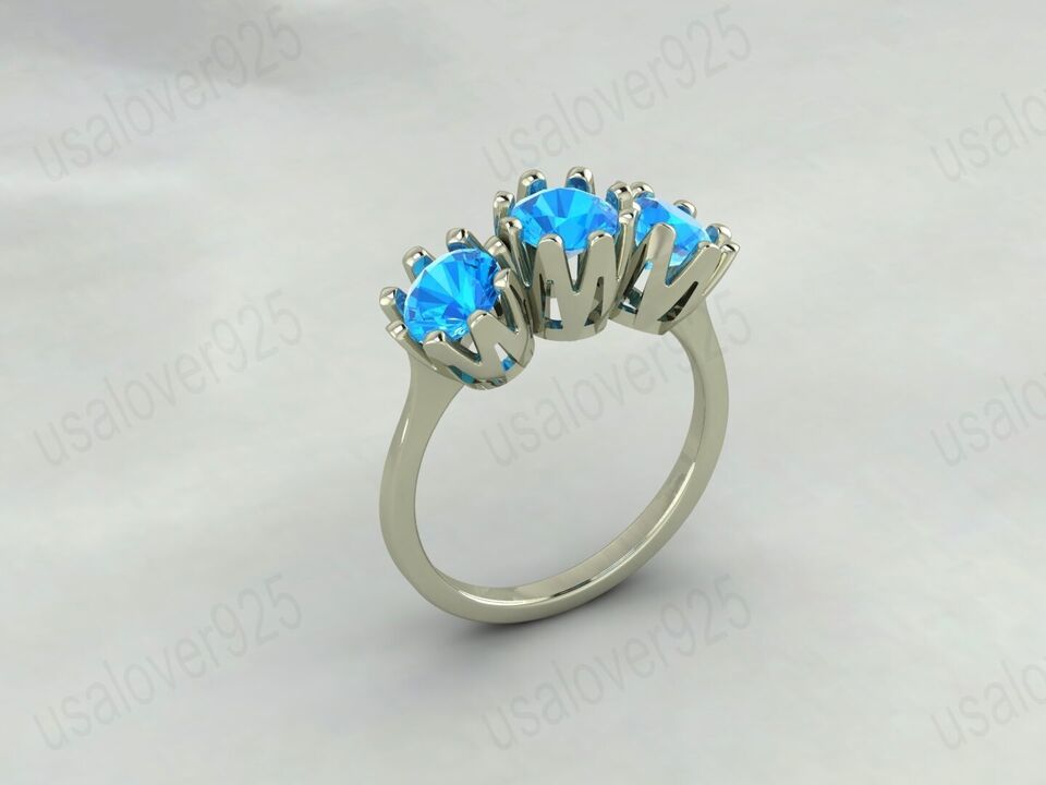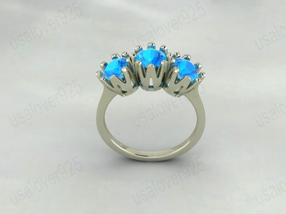 Blue Topaz Round Gemstone 925 Sterling Silver Three Stone Women Ring Jewelry