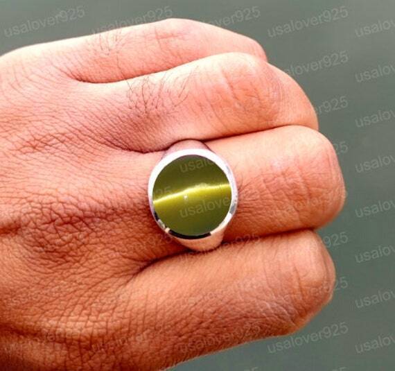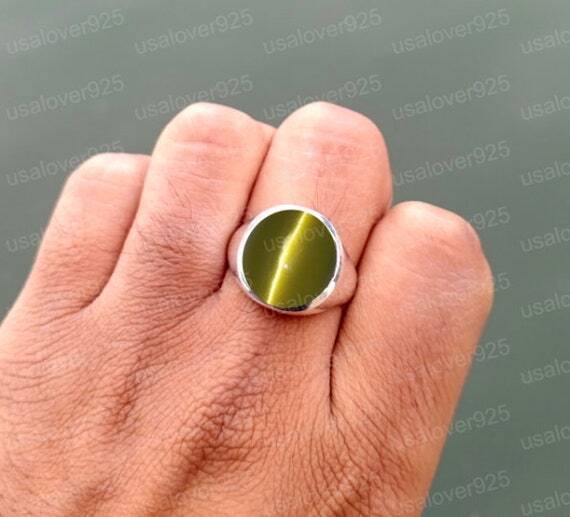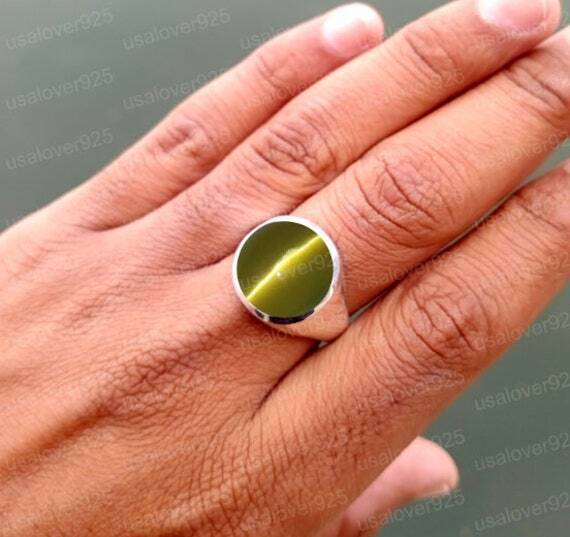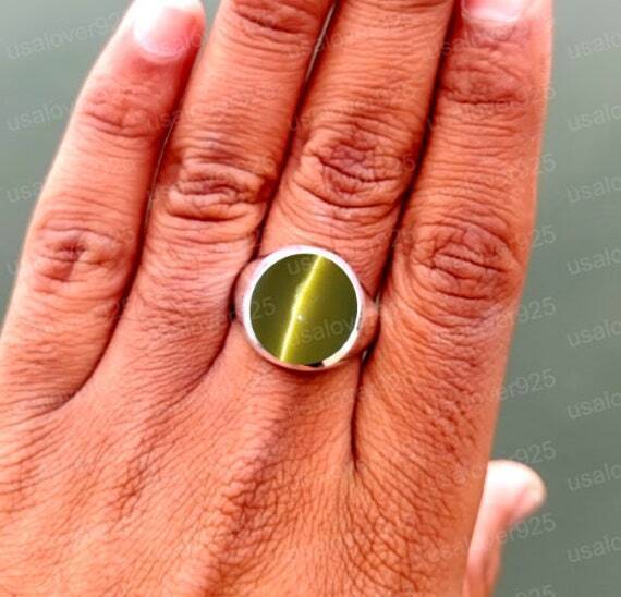 Chrysoberyl Cats Eye Round Gemstone Handmade High Quality White Brass Men Ring