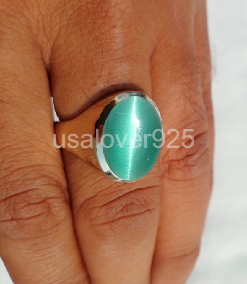 Natural Blue Cats Eye Chrysoberyl Gemstone Handmade High Quality Brass Men Ring