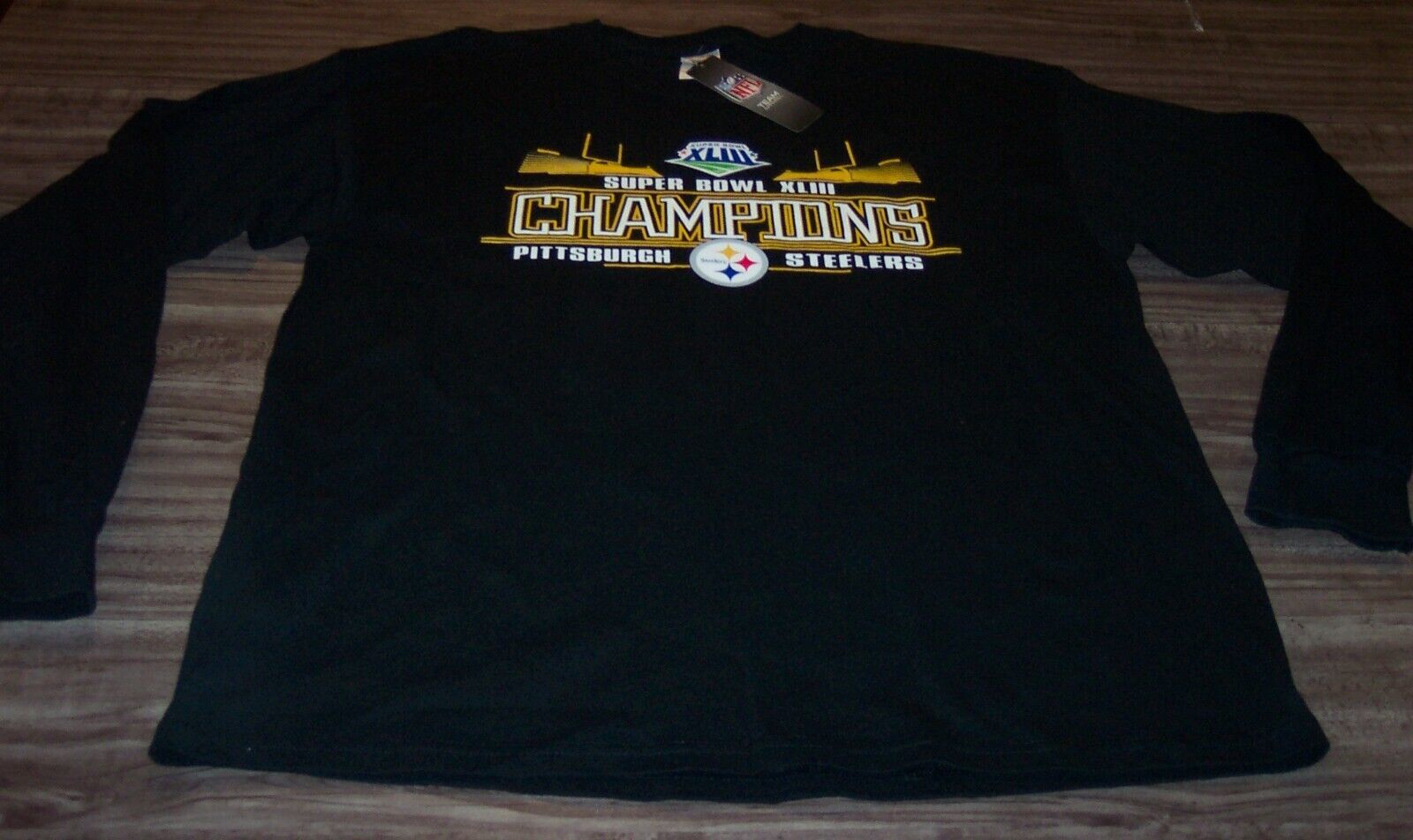 This is a PITTSBURGH STEELERS NFL SUPER BOWL XLIII CHAMPIONS Long Sleeve T-Shirt. It is a size XL, and it is NEW with the tag. It is 24 inches from armpit to armpit and 31 inches in length. It is an official NFL TEAM APPAREL Shirt. Combine auctions to save on shipping. D5AG