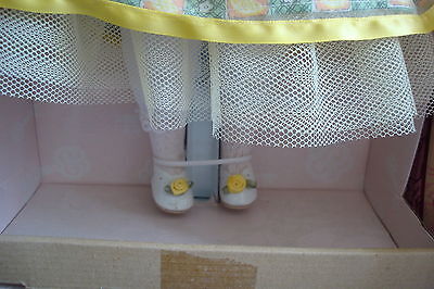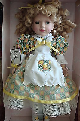 Victorian Garden beautiful doll named Cindy Lou, 16" tall, in box, new with no certificate. She sells lemonade for 5 cents! Porcelain head, hands and feet, cloth body. The box is missing the cover, great dress, ribbons and lace. Very good condition. With metal stand