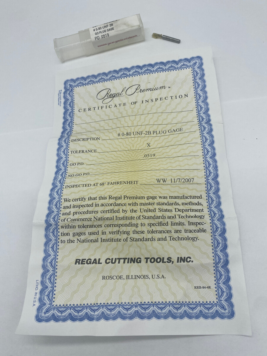 Regal Cutting Tools 0-80 UNF-2B Go PD 0.0519 Thread Plug Gage