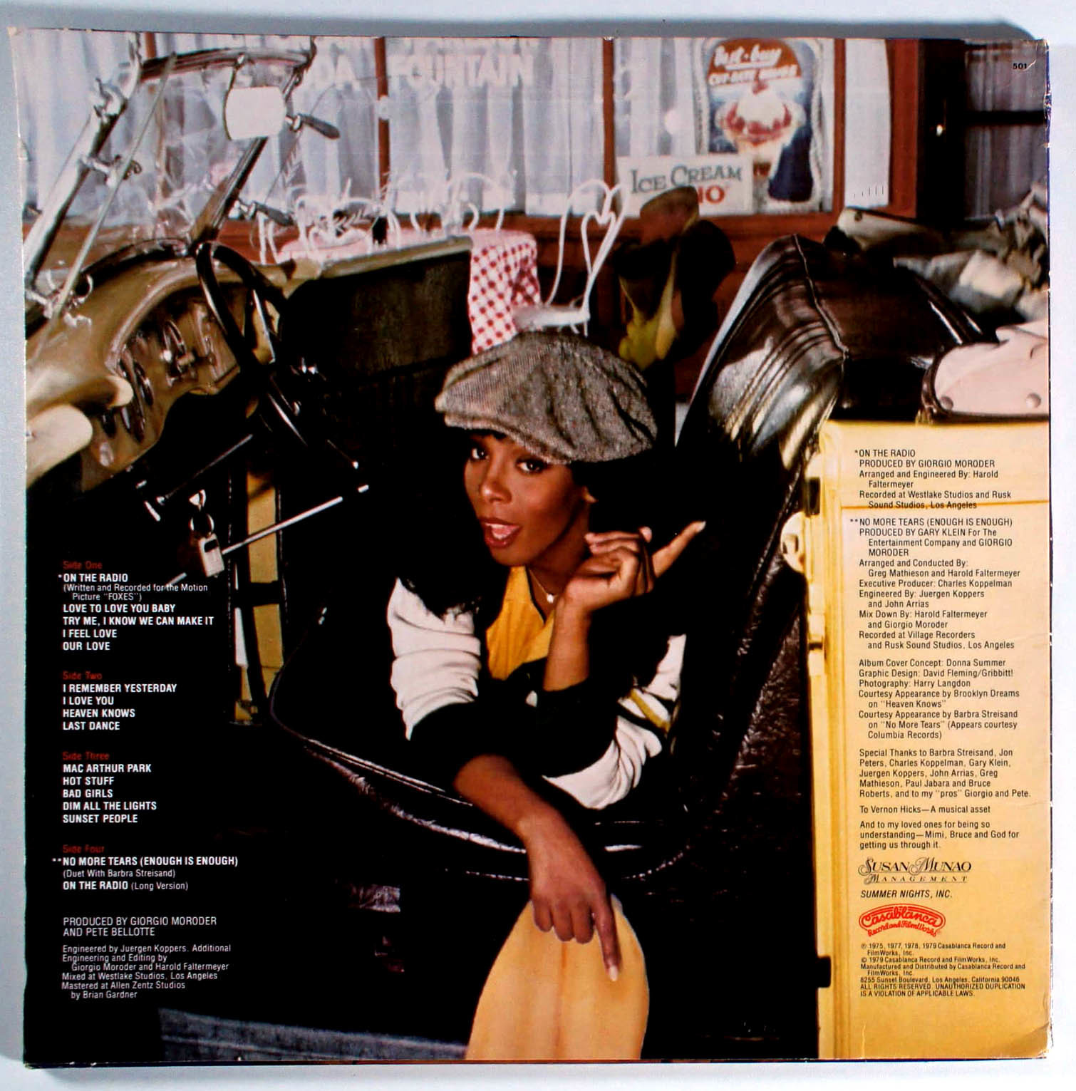 On the Radio: Greatest Hits Volumes I II , by Donna Summer made her the first person ever to take three consecutive double albums to No. 1. This would become Summer's third multi-platinum album and spanned Summer's career from her breakthrough, Love to Love You Baby right through to the more rock-influenced tracks of her Bad Girls album. The majority of the tracks were either remixed or edited, largely to fit such a large number of tracks onto two records. Each side, barring side D, runs as a continuous mix. The compilation also contained two brand-new tracks. The first of these was the pop-disco flavored On the Radio (which opened the album, and closed it in a longer version). Written for the film Foxes, this song was reminiscent of some of her other hits in that it started off with a slow beat. The song was nominated for a Grammy in the Best Female Pop Vocal Performance category. The second new track was a duet with Barbra Streisand entitled No More Tears (Enough Is Enough). It also had a slow beginning but evolved into a disco number. An early example of girl power, the song was released as a 12" Disco single and hit No. 1 spot on the Billboard Hot 100 (making it Summer's fourth chart-topper). It was also a big international hit, the shorter version of On the Radio was also released as a single, and became Summer's ninth Top 5 on the Hot 100. On the Radio was Summer's final release with Casablanca Records. She had not been happy for some time with the label's treatment of her - she felt exploited and that she was being made to portray a sexual image with which she was not comfortable. At one point this had driven her to depression and suicide attempts. However by 1979 she had become a born-again Christian and rediscovered herself. She signed a deal with Geffen Records in 1980. The album came with a 24x32 full color poster.