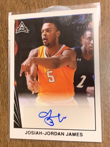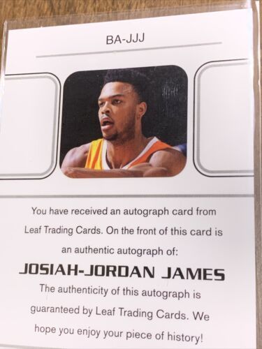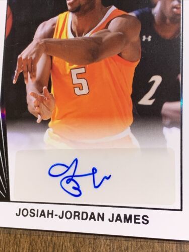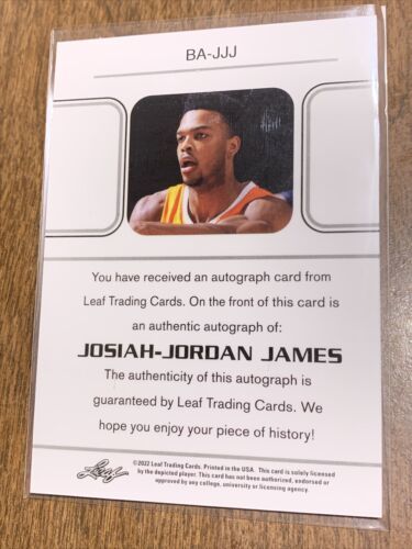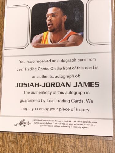 For sale is a 2022 Leaf basketball trading card featuring the autograph of Josiah-Jordan James. This rare card has a print run of 9/15 and is in excellent condition. It is a standard size sports trading card made of card stock and is an original, not a licensed reprint. The autograph is in the label or sticker format and has been authenticated by Leaf.