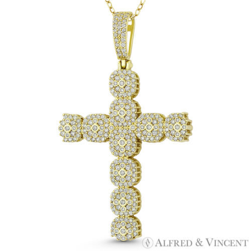 The featured pendant is cast in 14k yellow gold-plated .925 sterling silver and showcases a modern pave cross design made up of multiple clusters of cubic zirconia crystals then finished with a large sturdy bail that will accommodate most chain sizes.