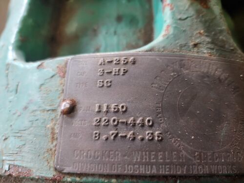 Antique/ Vintage Crocker Wheeler 3 hp 1150 RPM. Electric Motor 220/440 3Ph.