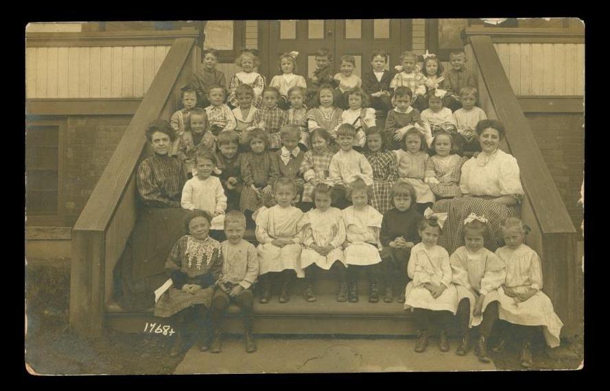 Vintage RPPC Real Photo Postcard Early 1900s Elementary School Kids Class Photo - full class and two teachers on the front steps of the school. Location unknown.