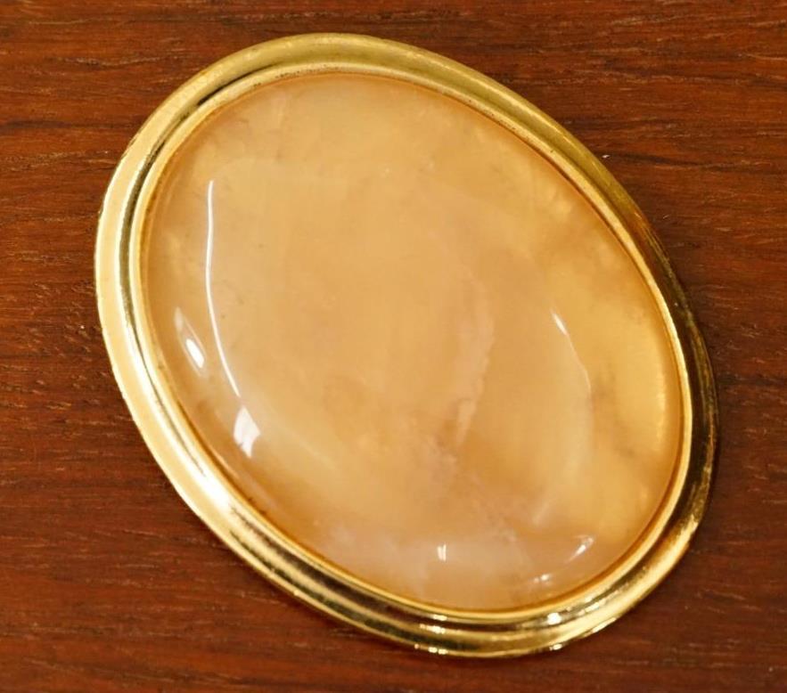 Vintage Costume Jewelry Rose Quartz Gold Tone Metal Oval Brooch Pin - measures 1-7/8" by 1-3/8" natural rutilations in the stone. No smoke or pet odors.