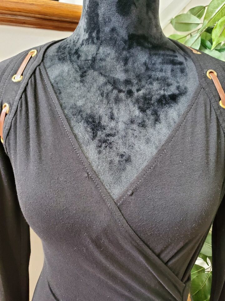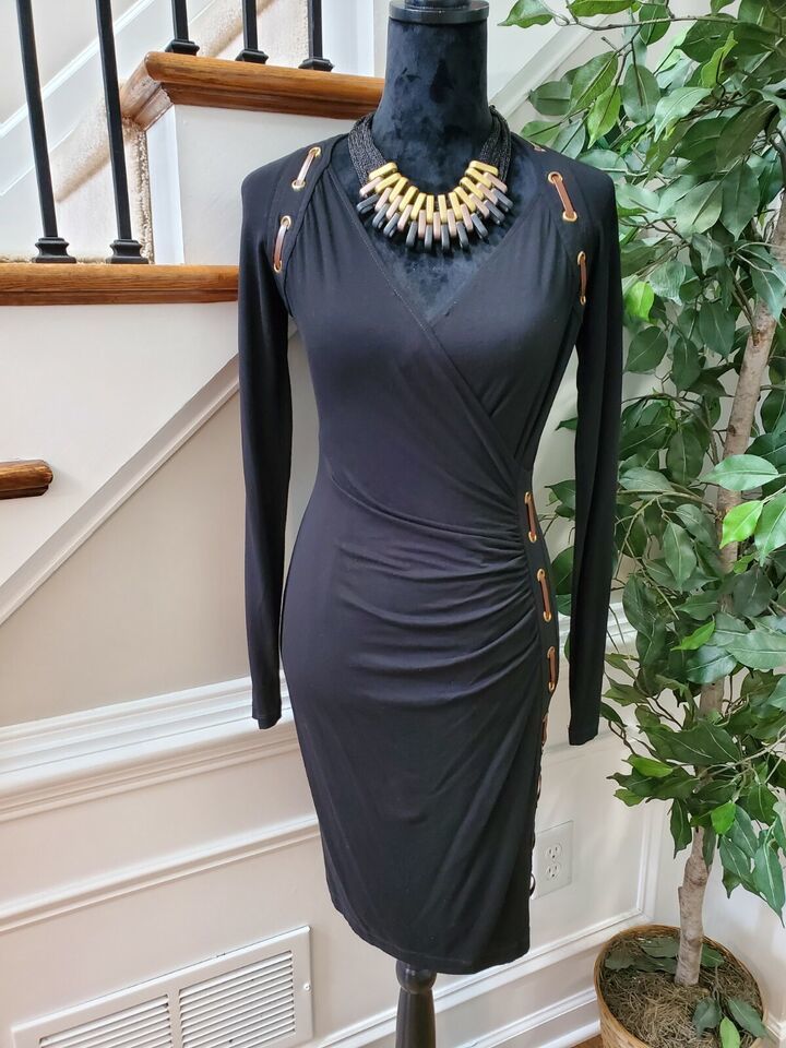 Carmen Women's Solid Black Rayon Long Sleeve V-Neck Knee Length Dress Size Small