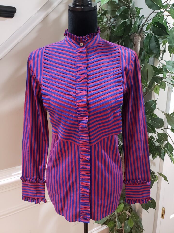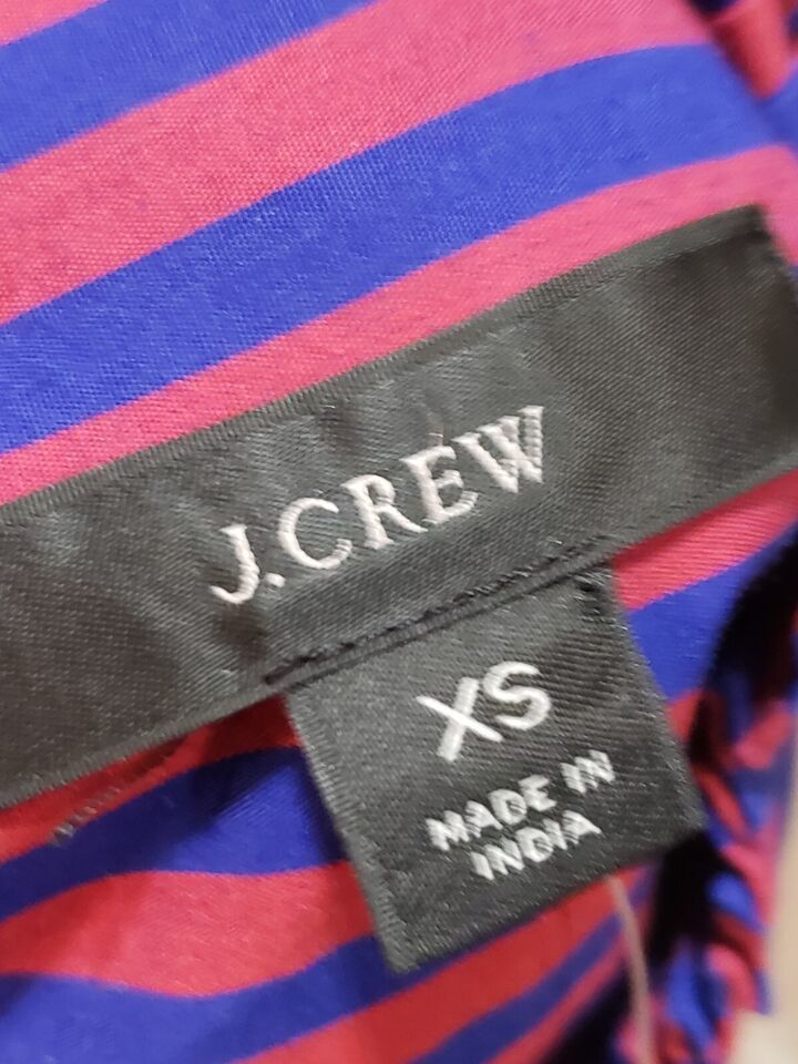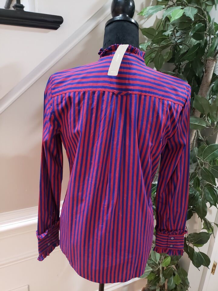 J. Crew Women's Red Blue Striped Long Sleeve Ruffle Trim Tuxedo Top Blouse XS.