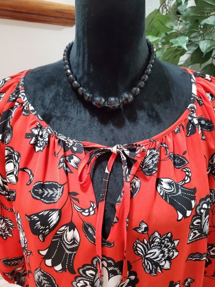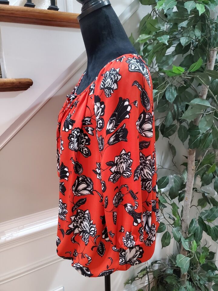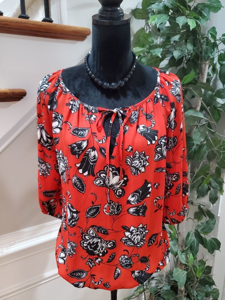 Vince Camuto Womens Red Floral Round Neck Drawstring Long Sleeve Top Blouse S