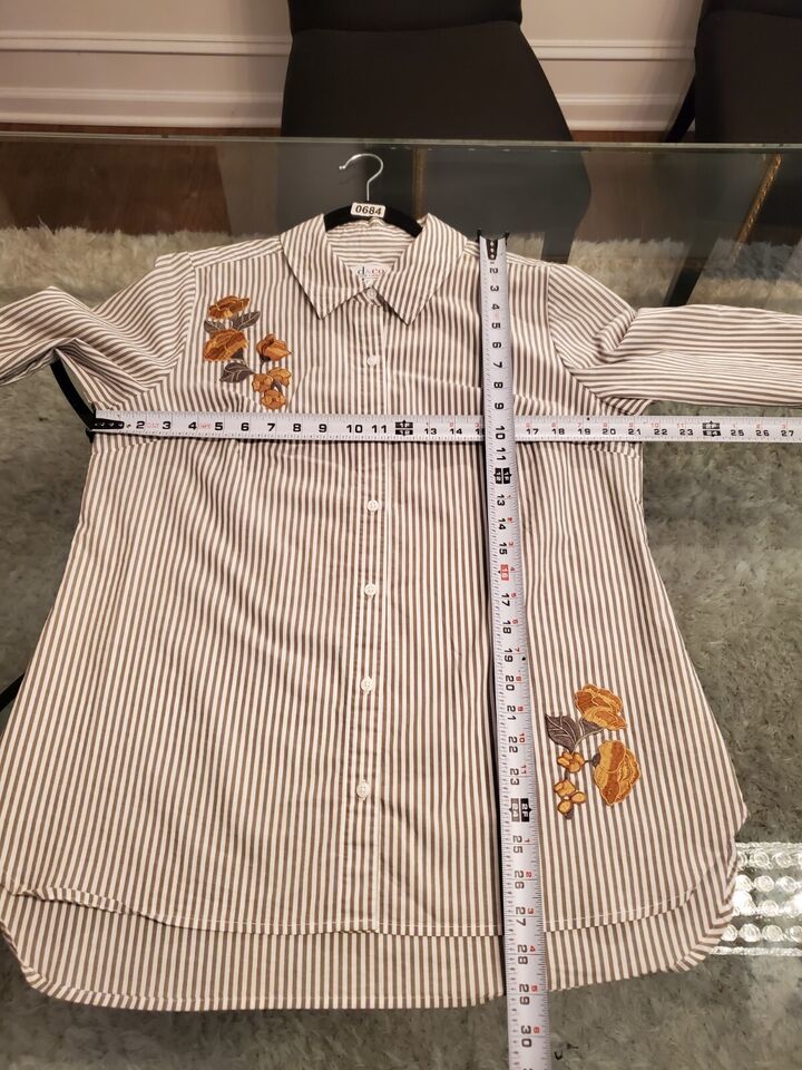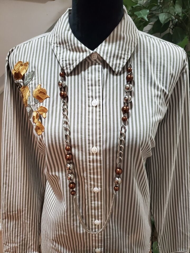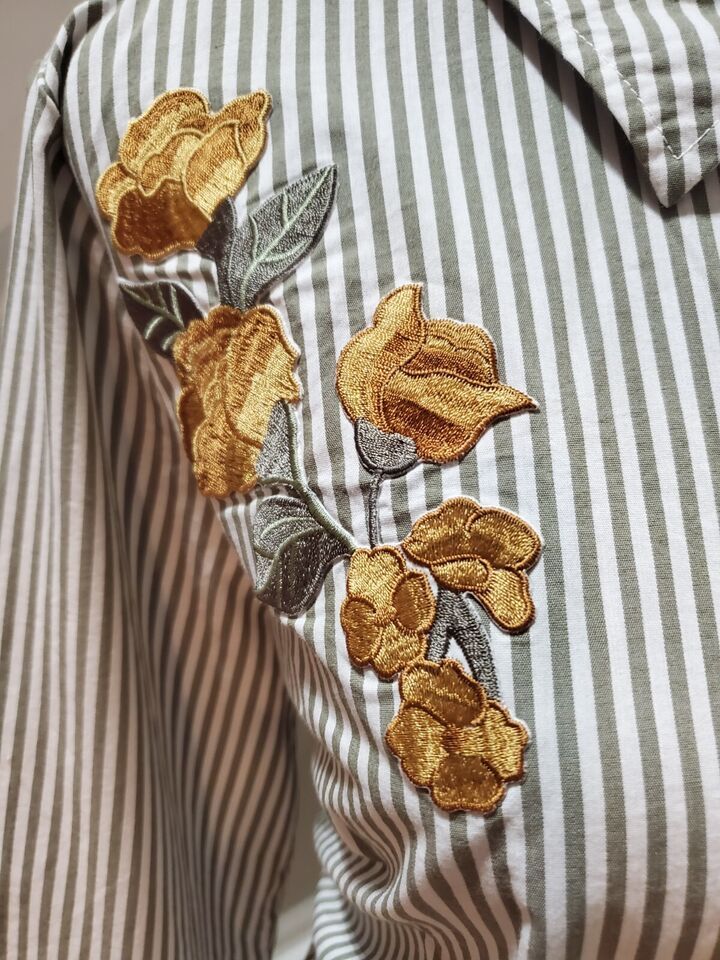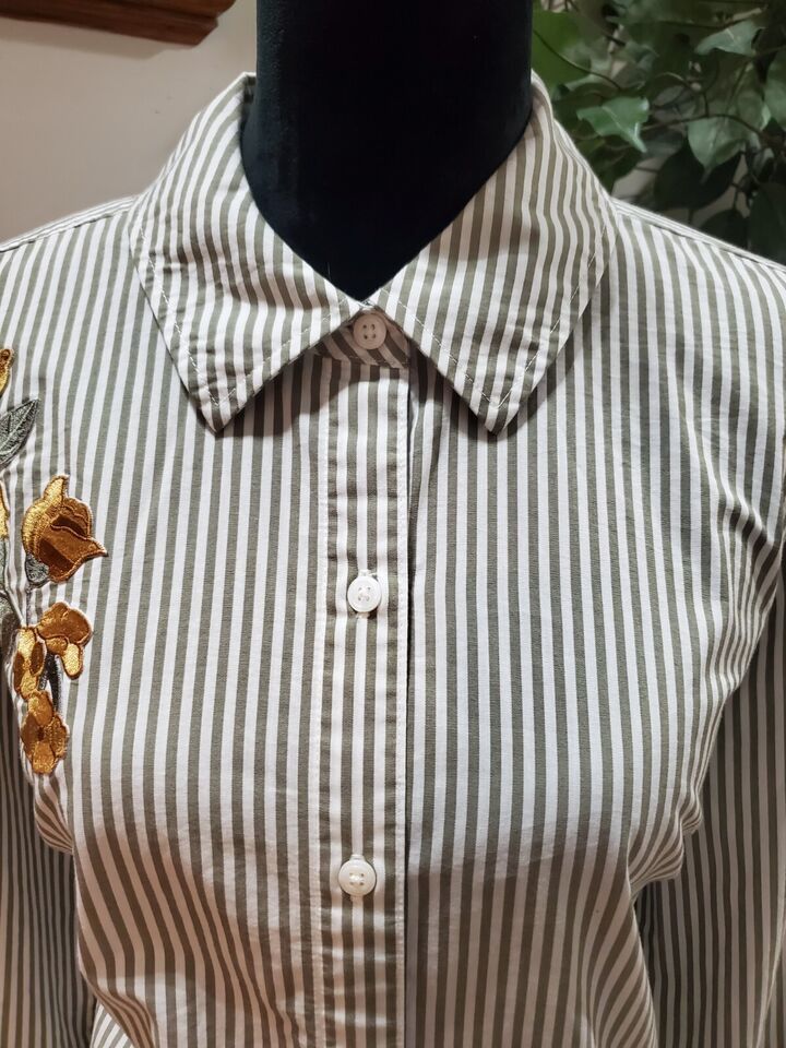 Denim & Co. White Green Striped Embroidered Flower Long Sleeve Shirt Size M