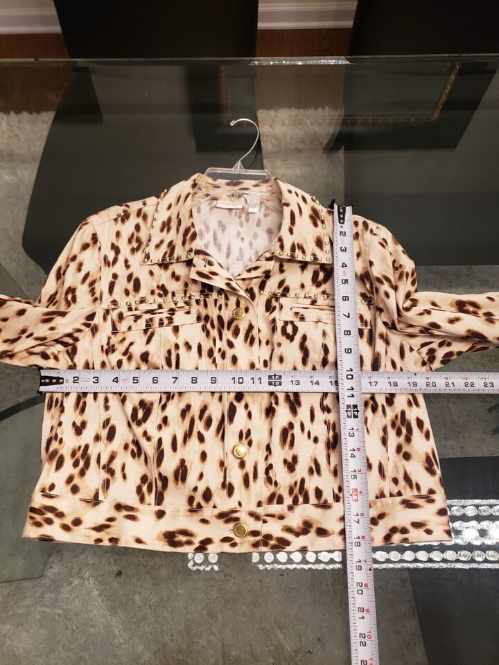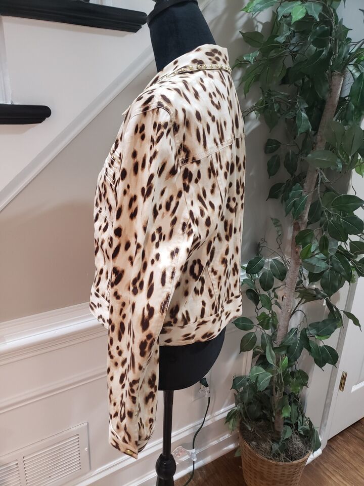 Chico's Women's Beige Leopard 100% Cotton Long Sleeve Button Front Jacket 2(L)
