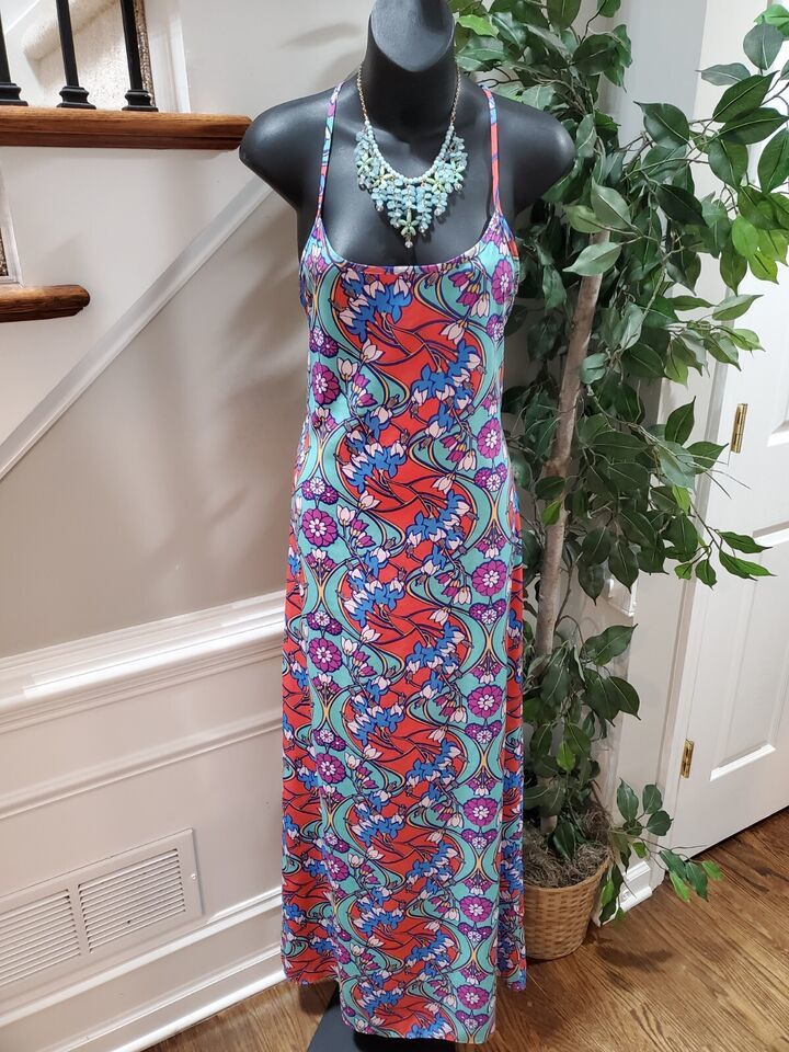Peach Love Women Blue Floral Polyester Halter Neck Sleeveless Long Maxi Dress S