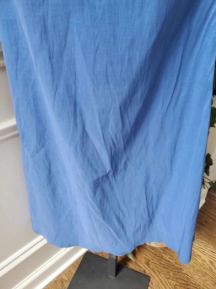 The solid blue color and modern theme make it a versatile addition to your collection, while the unique accents of a collarless design and a zipper add a touch of personality. Hand wash only to keep it looking new. This dress is perfect for any fashion-forward woman looking for a chic and sophisticated outfit.