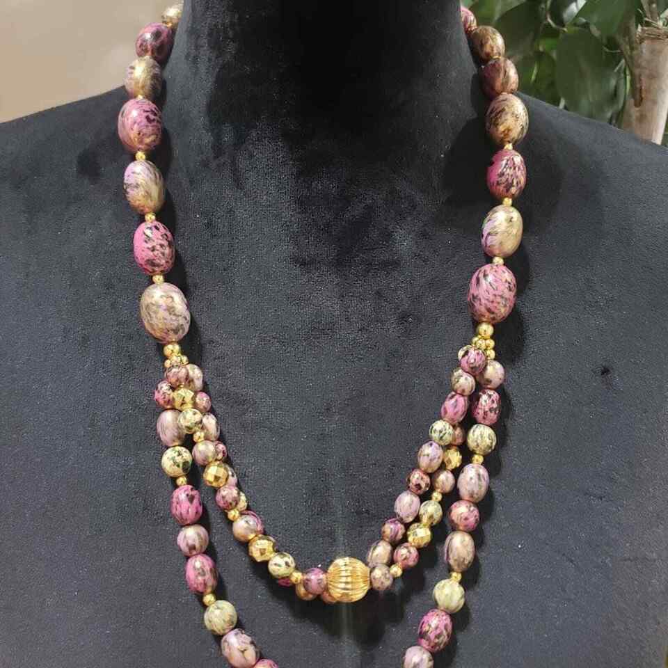 Womens Fashion Triple Strand Pink and Gold Color Stones Chunky Beaded Necklace