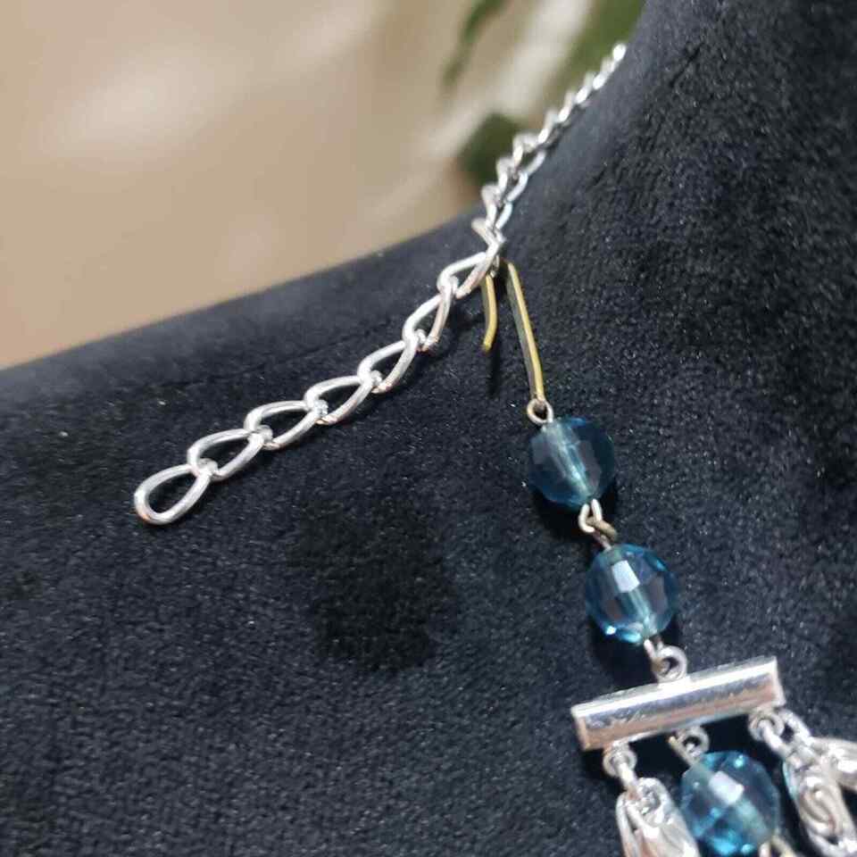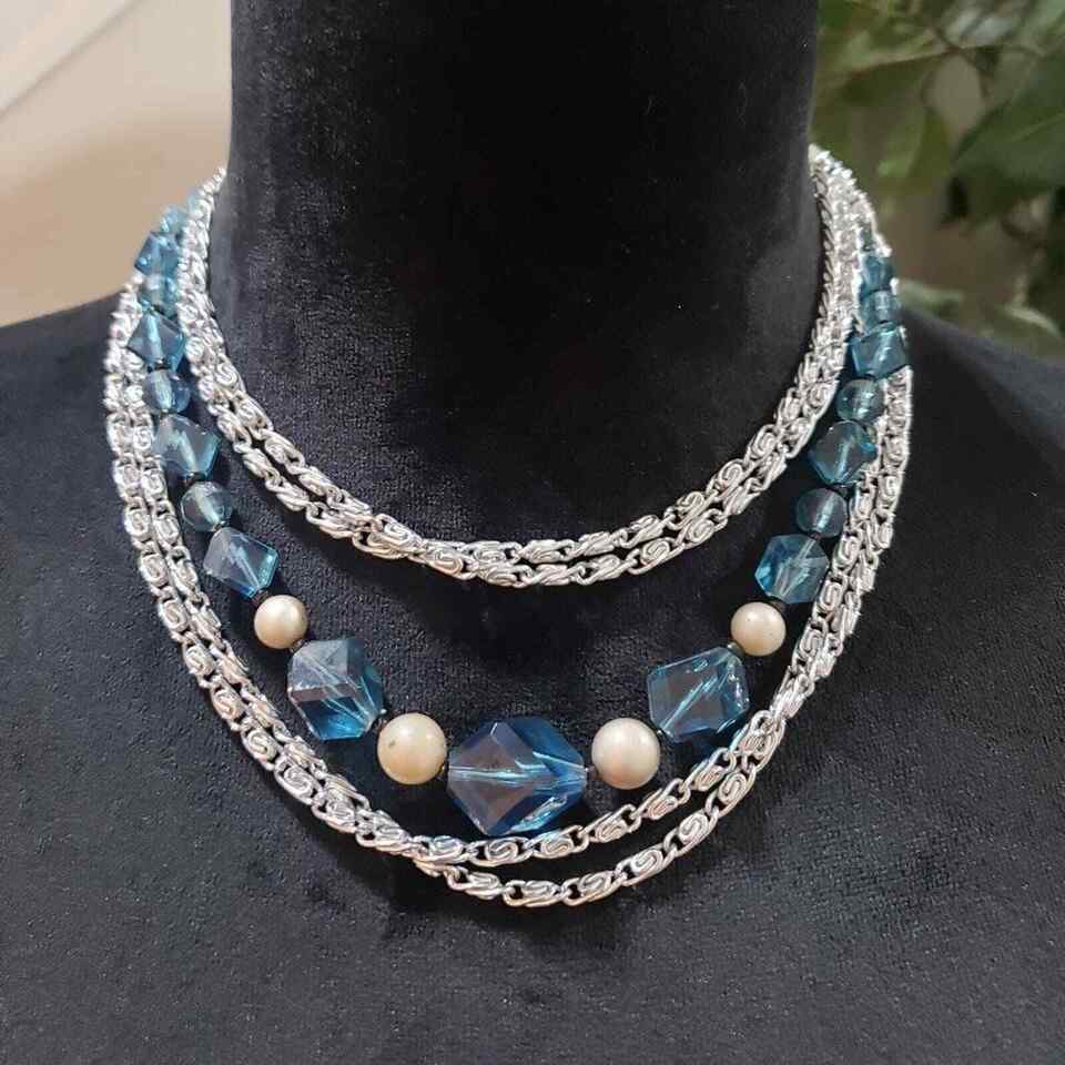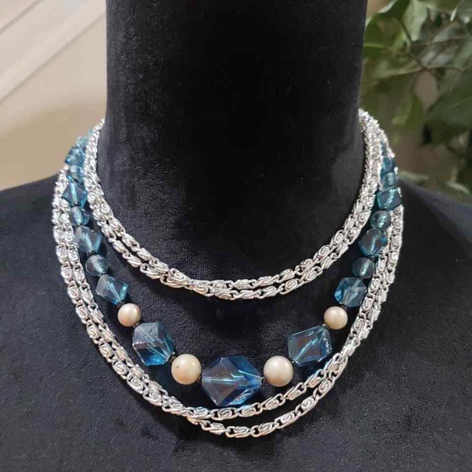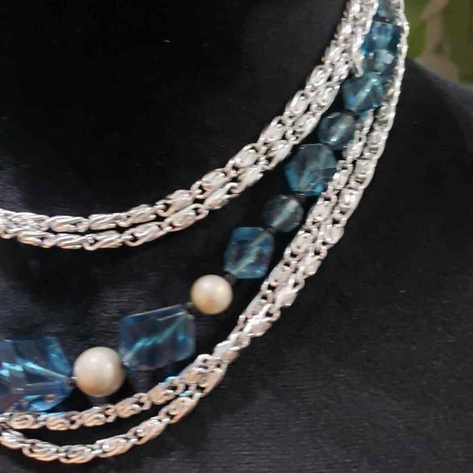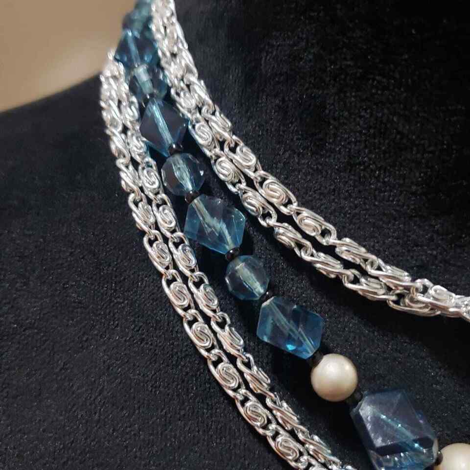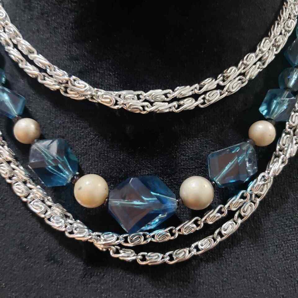 Womens Bohemian Multi Strand Faux Pearl Blue Beaded Silver Tone Chain Necklace