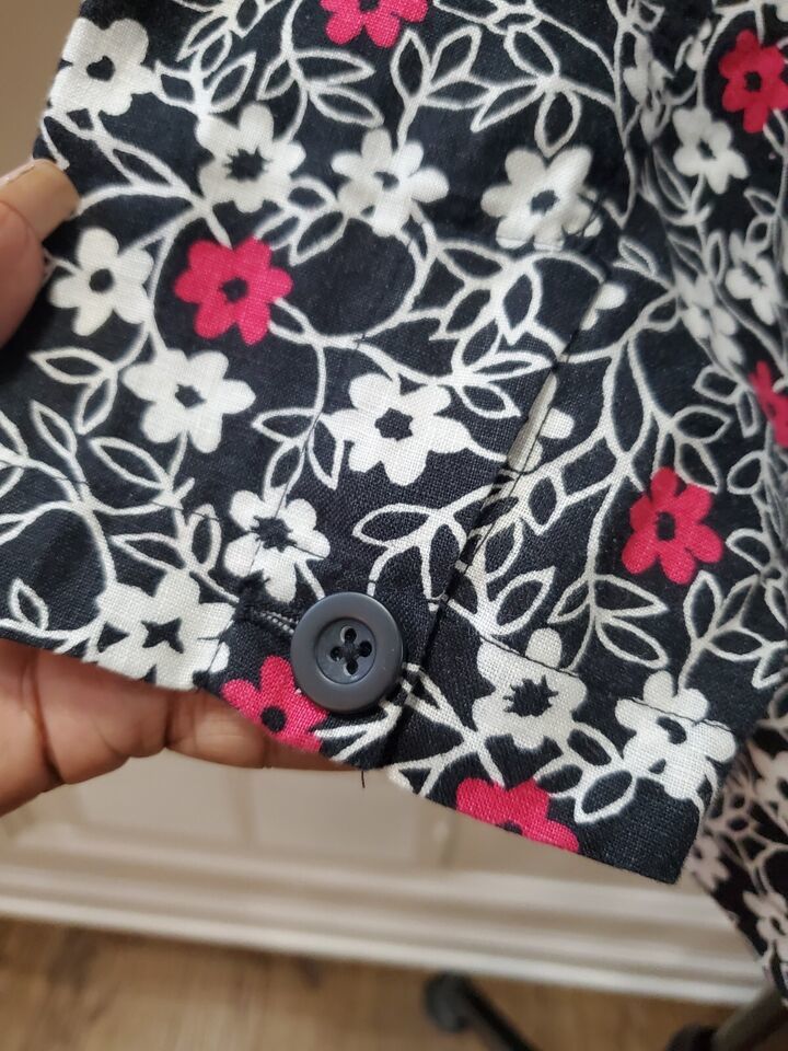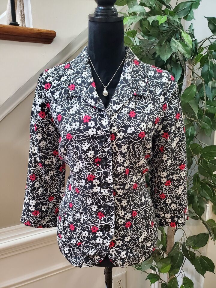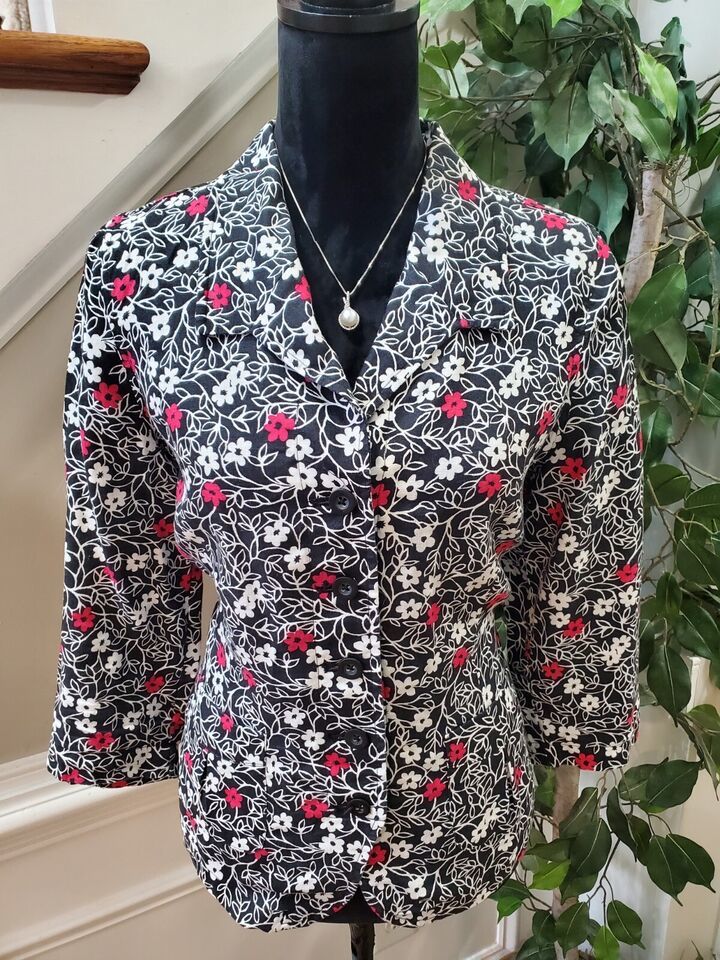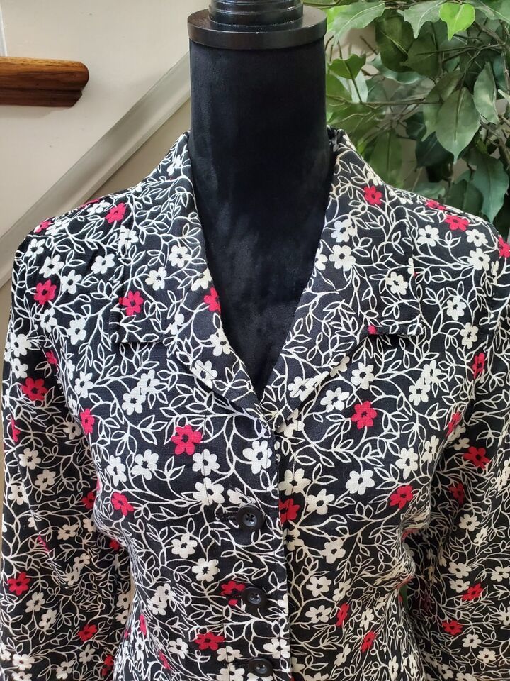 Kim Rogers Women's Black Floral Linen Collared Long Sleeve Button Down Shirt 12.
