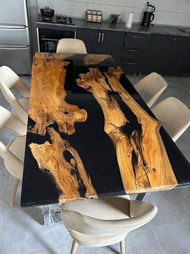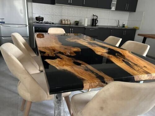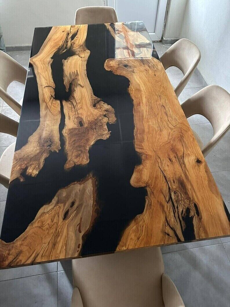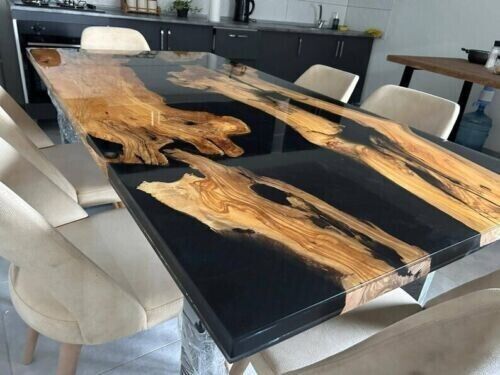 Our epoxy tables are custom-made, and we strive to use the same type of wood as depicted in our advertising pictures. However, it is not always possible to find an exact match, which may result in slight variations in the epoxy color and wood grain pattern.