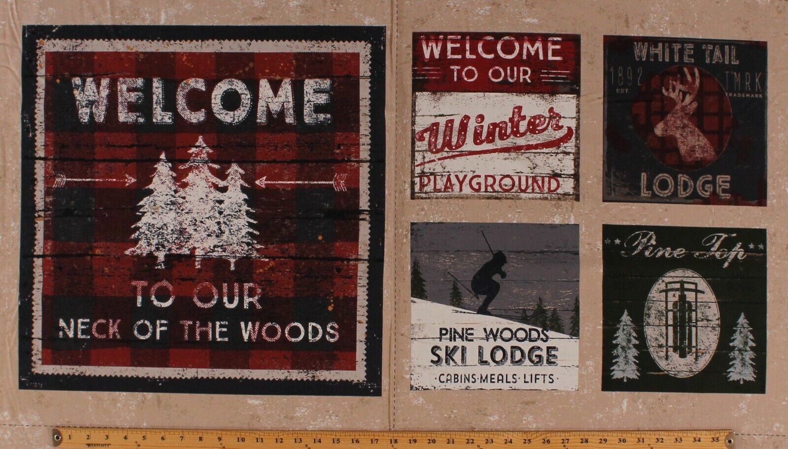 23.5" X 44" Panel Snow Lodge Cabin Winter Playground Ski Lodge Skiing Sports Plaid Cotton Fabric Panel (D756.08)