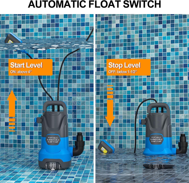 ?Automatic Float Switch?: Comes with an automatic float switch. When water level is below 1-1/2 Inch inch, it will automatically disconnect the power; when water level rises above 4 inch, the pump will start again. If you lock the float switch on the bracket of the pump, the pump will work all the time and the power will not shut off automatically. Please cut off immediately when the pump fails to pump water to prevent from dry running.