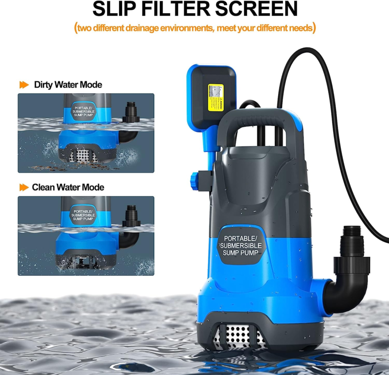 ?Dirty Clean Water Removal?This sump pump is designed with a filter screen on the bottom, ideal for draining both clean/dirty water from any enclosing environment. Slide it down to block particles larger than 1/5?(5mm) for extracting cleaner water; Slide up to open the filter and allow particles up to 1-1/5" (30mm) to pass through for draining dirty water. The pump is not for applications involving corrosive or flammable liquids.
