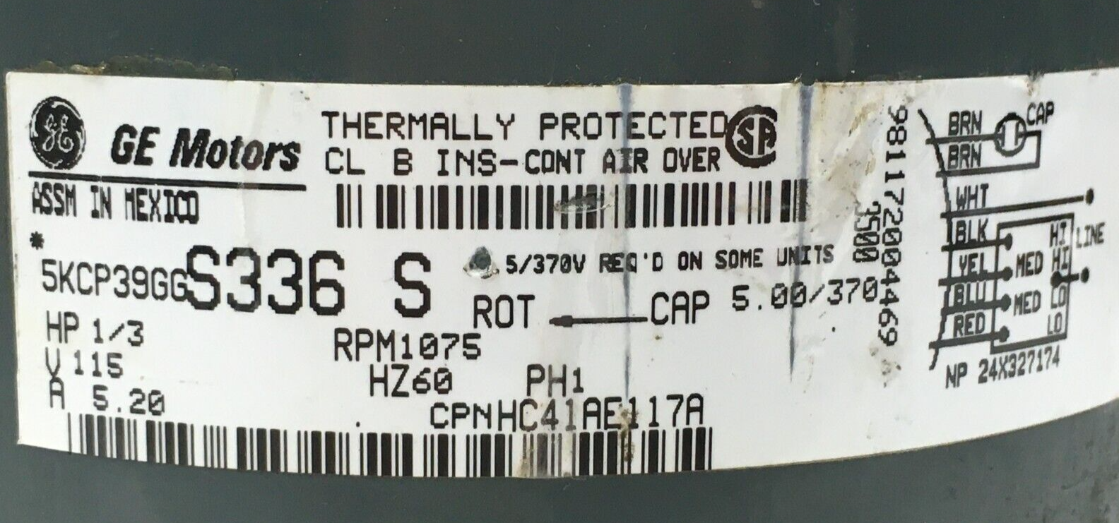 This is GE 5KCP39GGS336S Blower Motor 1/3HP 1075RPM 1PH 115V HC41AE117A used part.
